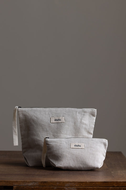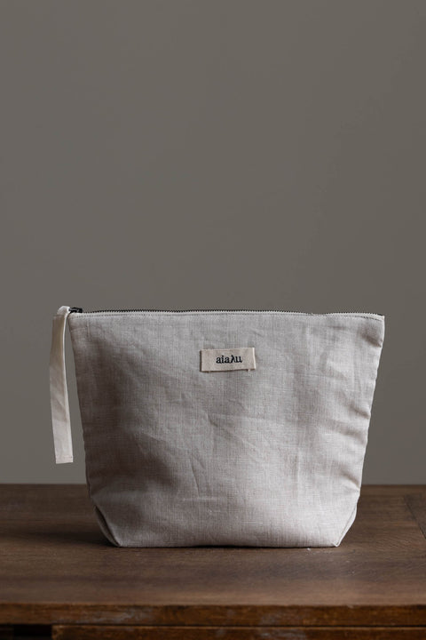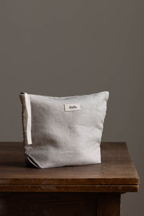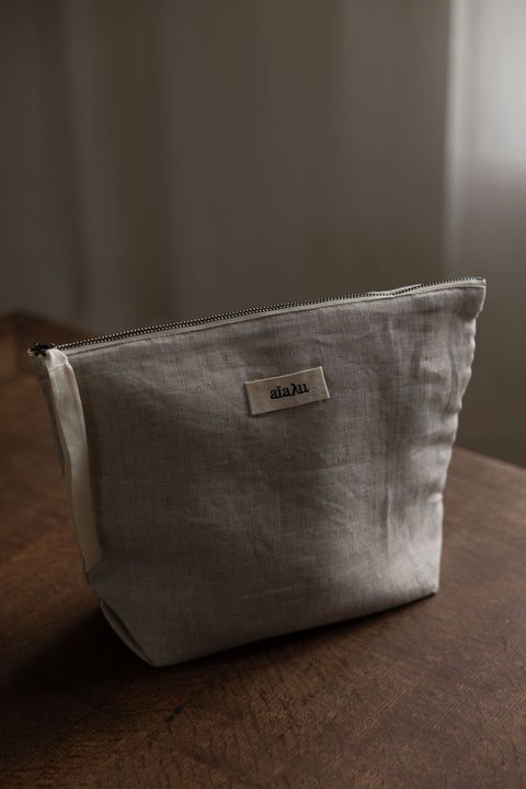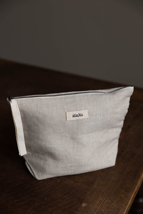 Aiayu Pouch Linen er Aiayus signaturmappe i lin med glidelåslukking, dekorativt bånd og slitesterkt fôr, i en praktisk størrelse som passer perfekt til sminke, toalettsaker eller andre små nødvendigheter du vil samle i vesken eller kofferten, og den kan vaskes i maskin for enkel rengjøring.