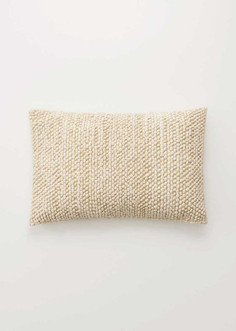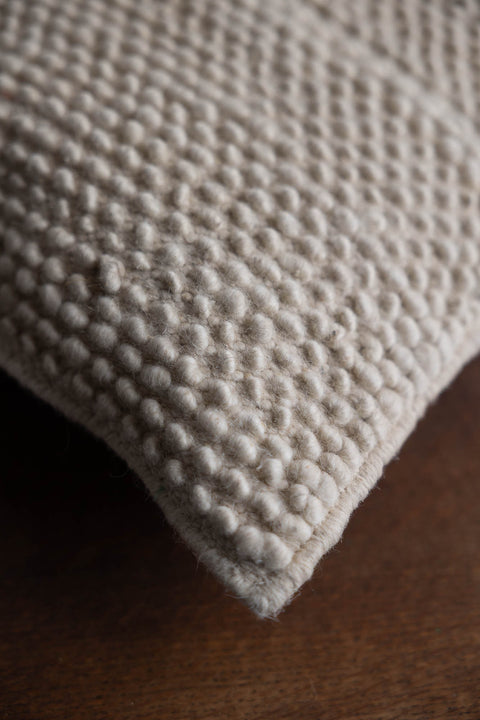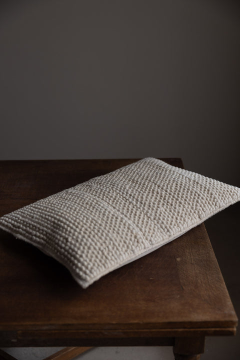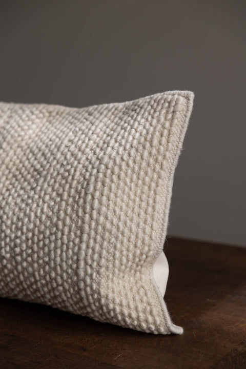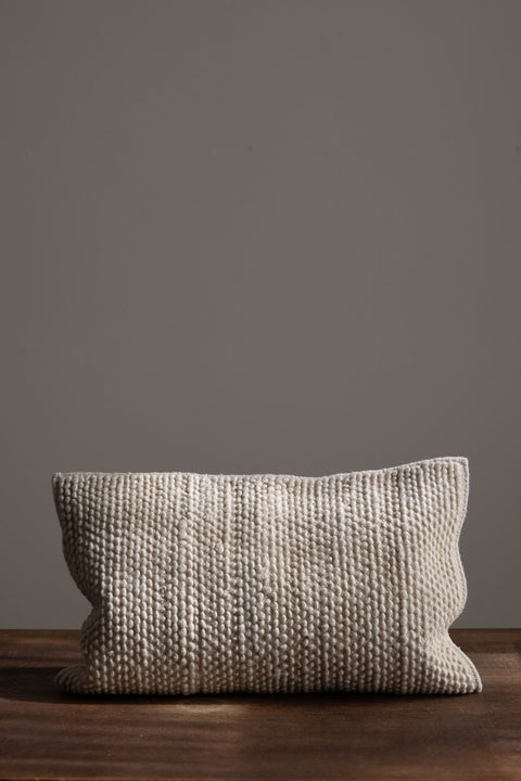 Aiayu Idras Wool Pillow – 40x60 er en dekorativ pute laget for hånd i en raffinert blanding av tibetansk ull og økologisk bomull, med taktil struktur, brodert Aiayu-logo og konvoluttlukking, vevd på tradisjonelle håndvever i et lokalt verksted i Kathmandu som en hyllest til det nepalske håndverket der hvert produkt er et unikt stykke laget med omtanke og ferdighet. Fyll følger med.