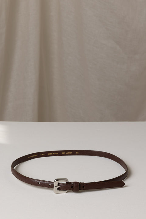 Smalt skinnbelte med sølvfarget spenne fra italienske Sergio Gavazzeni. Sergio Gavazzeni er kjent for sin høye kvalitet, og håndverket deres skiller seg ut ved å gi klassiske design en ny vri – noe som tydelig kommer frem i dette beltet. Gloriosa er allsidig og kan brukes både til jeans eller for å fremheve midjen over en kjole eller jakke. Dette er en investering som varer år etter år!
