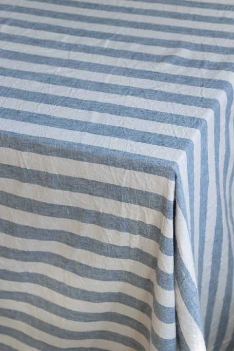 Himla Riviera duk i fargen Azur kombinerer skandinavisk enkelhet med sommerlig friskhet. Laget av halvlin (55 % lin, 45 % bomull), har duken en myk og avslappet struktur med brede, horisontale striper i lyseblått og hvitt. Den er vasket etter søm for å gi en uformell og levende tekstur, perfekt for både hverdagsbruk og festlige anledninger