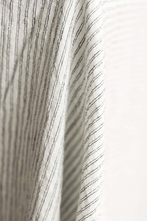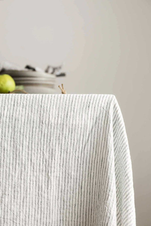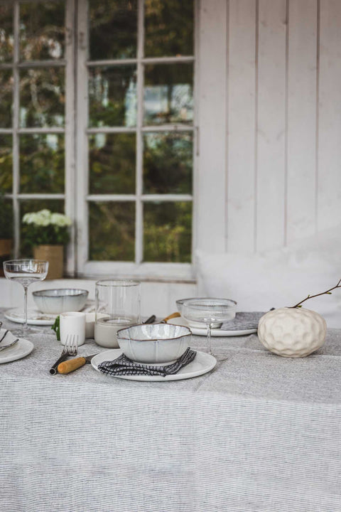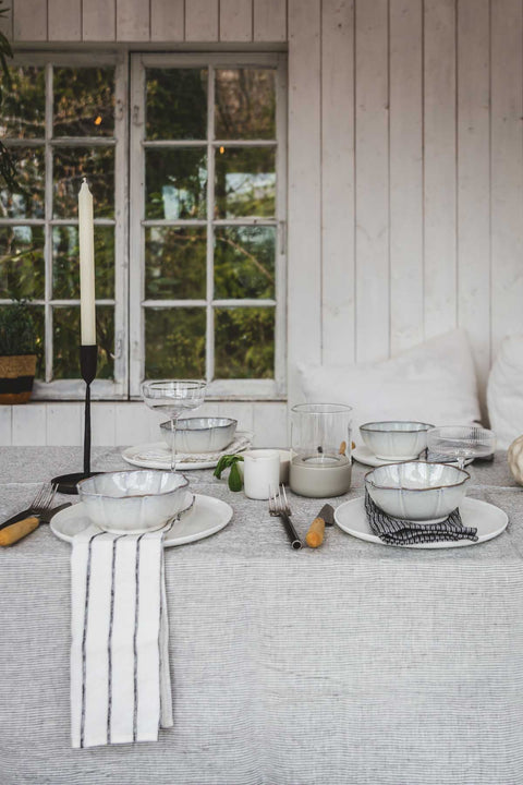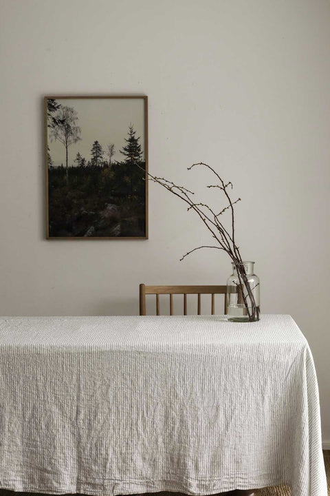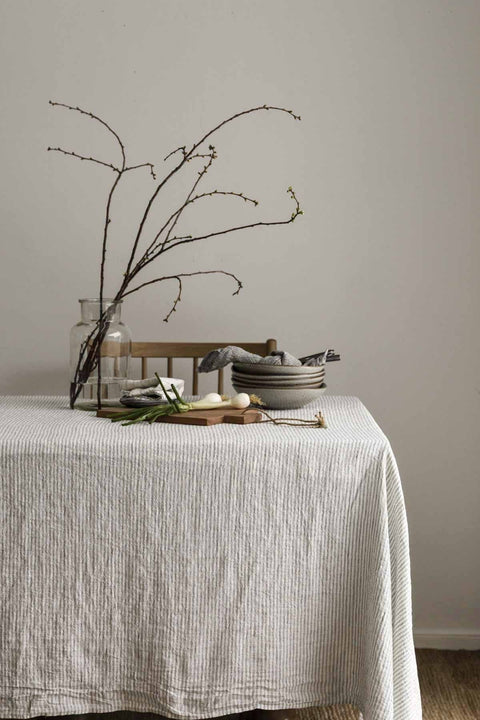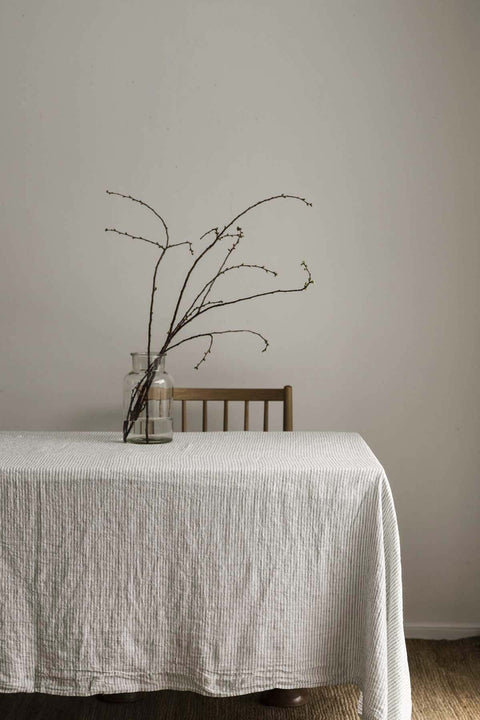 Linge Particulier har en kvalitet som ikke kan kopieres, og den litt krøllete teksturen etter vask gjør den bare enda vakrere – stryking er ikke nødvendig! Denne duken er like perfekt hjemme som på hytta, og er et produkt vi er stolte av å ha i Bolina.