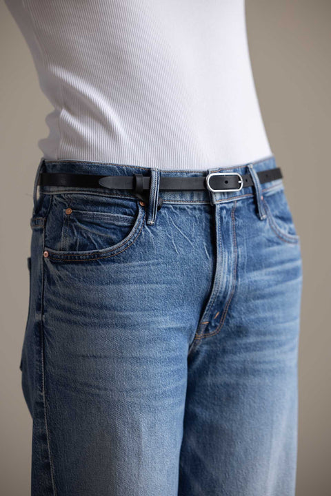 En av Rag & Bone sine bestselgende belter kombinerer italiensk kalveskinn med et avlangt sølvfarget ovalt beltespenne. Det er et hverdagsplagg som hører hjemme i enhver allsidig garderobe. Passer like godt i bukselinningen som over en kjole eller blazer for å fremheve midjen.