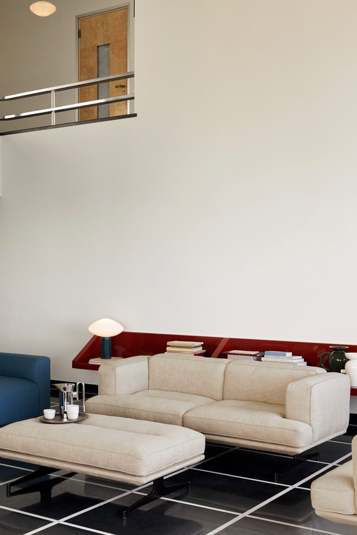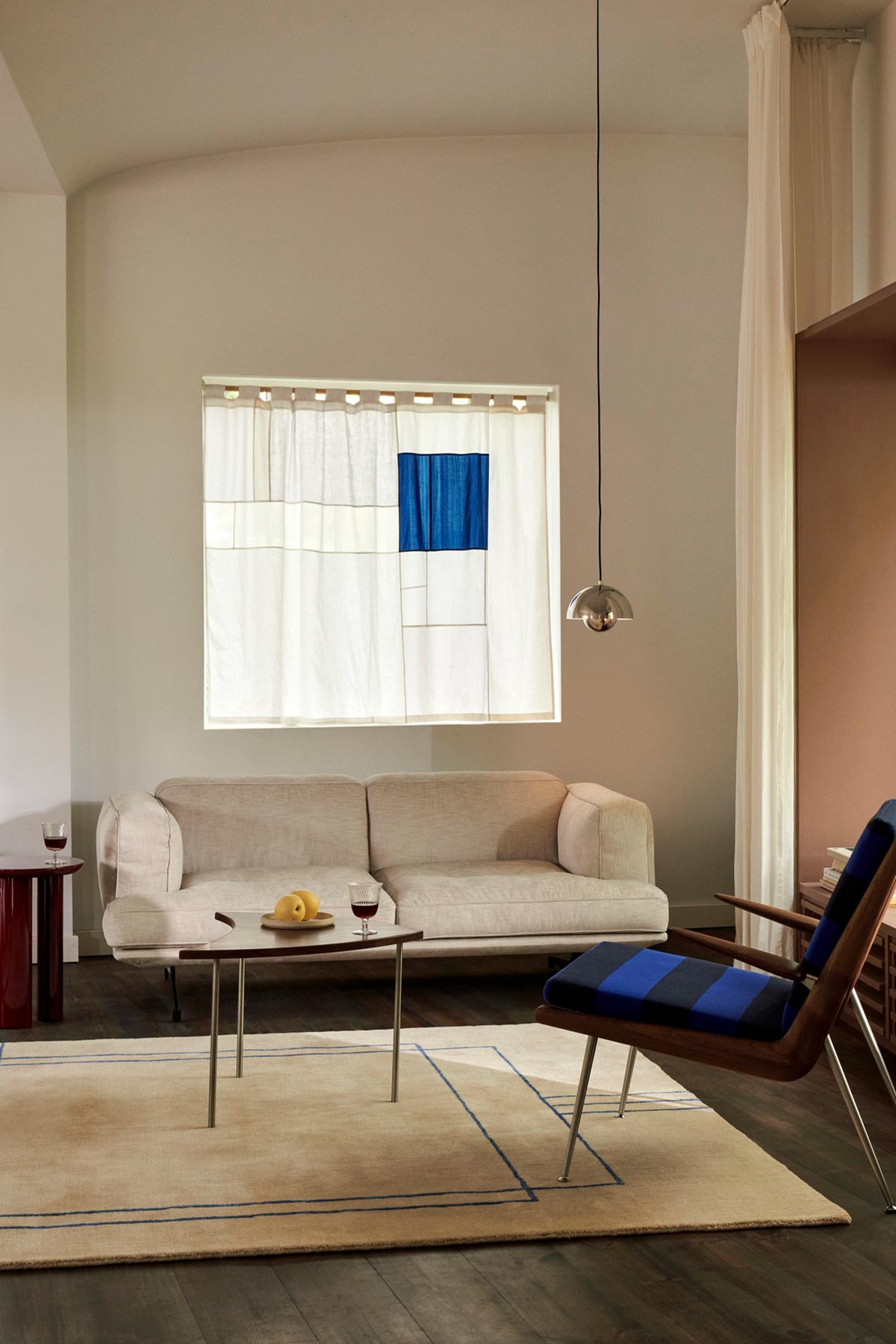 Inland AV22 2-seter sofa, designet av den Oslo-baserte designduoen Anderssen & Voll for &Tradition. Designerne ønsket en sofa som skulle gi masse komfort innenfor et klart definert arkitektonisk rammeverk. Med denne visjonen i tankene, designet de Inland, en lav, dyp sofa med høye armlener og en varm, sort stålfot som gir følelsen av at sofaen svever. Sofaens ramme er laget av massiv bøk og kryssfinér og deretter dekket med HR-skum, dyner og polyestervatt. Metallbena er frest og sveiset og deretter pulverlakkert. Stoffet sofaen er trukket i, Clay, består av en blanding av lin og bomull. Stoffet har en unik, strukturert overflate som gir en ekstra dimensjon til ethvert design og er perfekt for å polstre møbler. Inland finnes også som en romsligere 3-seter og kan bestilles med base i aluminium i stedet for sort, og i et hav av andre stoffer. Kom gjerne innom Bolina for å slå av en prat og kikke på stoffprøver.