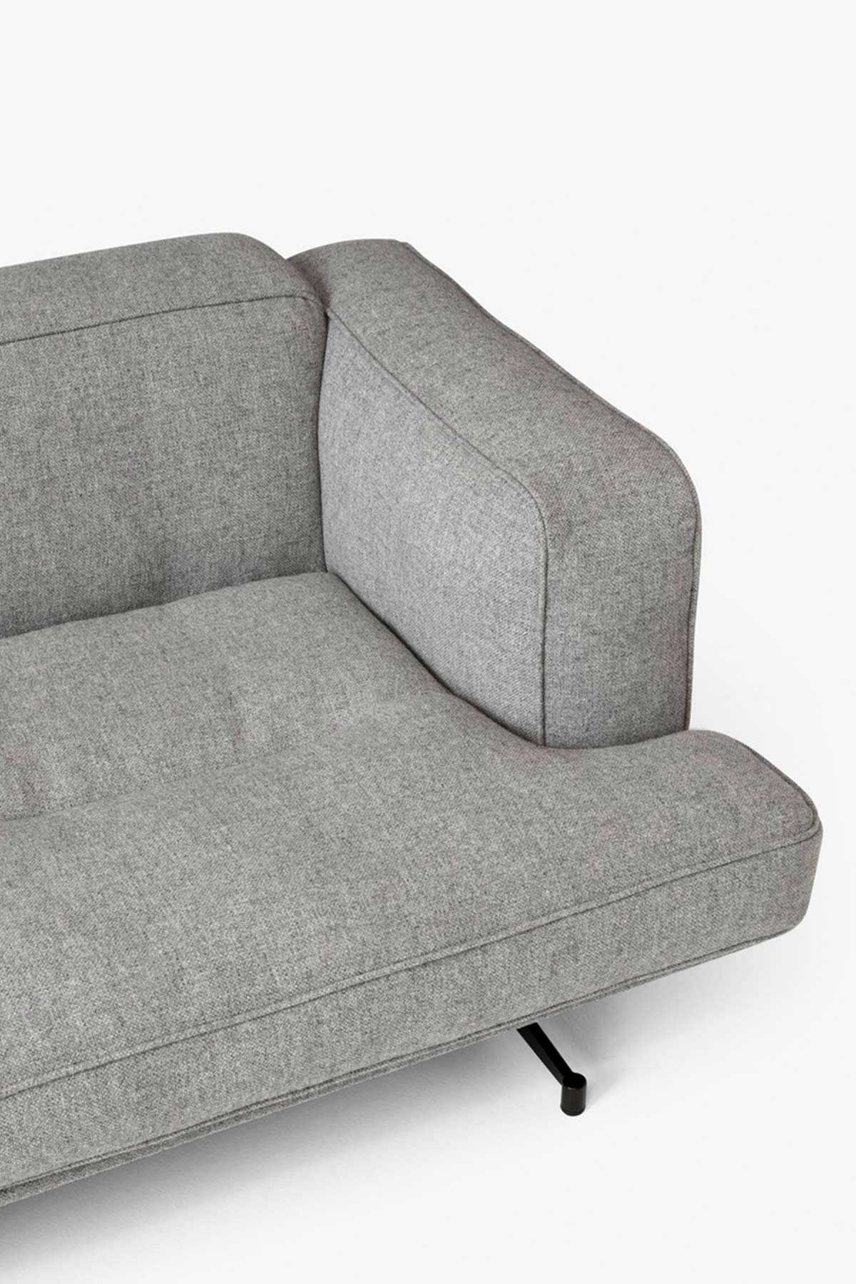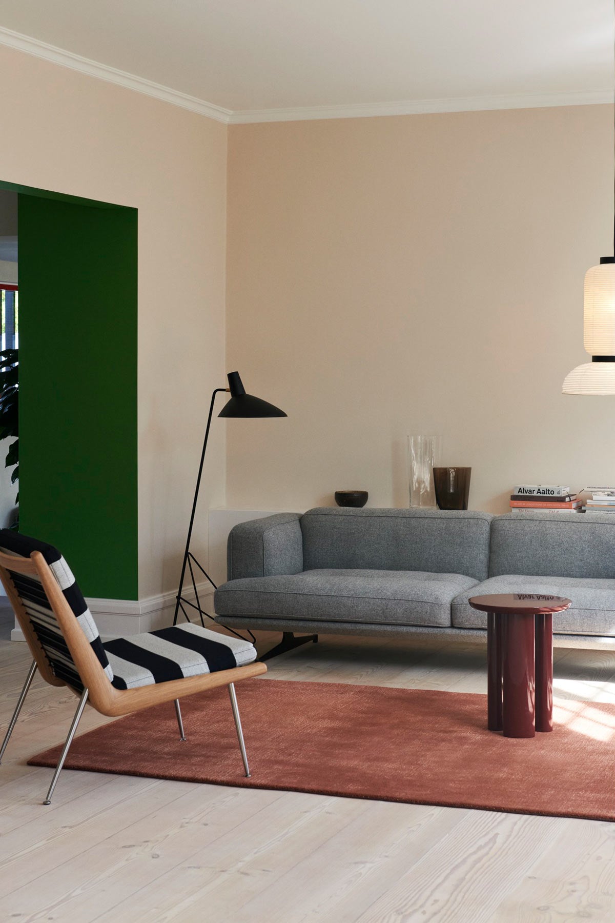 Inland AV22 2-seter sofa, designet av den Oslo-baserte designduoen Anderssen & Voll for &Tradition. Designerne ønsket en sofa som skulle gi masse komfort innenfor et klart definert arkitektonisk rammeverk. Med denne visjonen i tankene, designet de Inland, en lav, dyp sofa med høye armlener og en varm, sort stålfot som gir følelsen av at sofaen svever. Sofaens ramme er laget av massiv bøk og kryssfinér og deretter dekket med HR-skum, dyner og polyestervatt. Metallbena er frest og sveiset og deretter pulverlakkert. Stoffet sofaen er trukket i, Hallingdal 130, består hovedsakelig av ny ull og viskose. Hallingdal er et svært slitesterkt møbelstoff som opprinnelig ble designet i 1965 av Nanna Ditzel, og er nå tilgjengelig i en versjon med oppdatert fargeskala. Laget av ull og viskose, som utfyller hverandre godt: Ulla gir utmerket slitestyrke og fleksibilitet, mens viskose tilfører glans og dybde til fargen. Begge materialene farges før de spinnes, noe som fremhever stoffets rike tekstur. Inland finnes også som en romsligere 3-seter og kan bestilles med base i aluminium i stedet for sort, og i et hav av andre stoffer. Kom gjerne innom Bolina for å slå av en prat og kikke på stoffprøver.