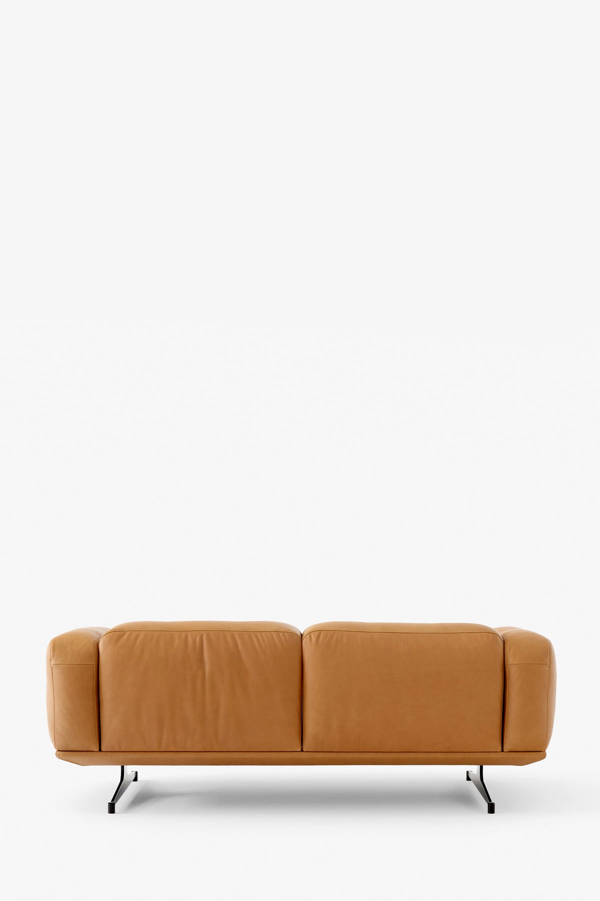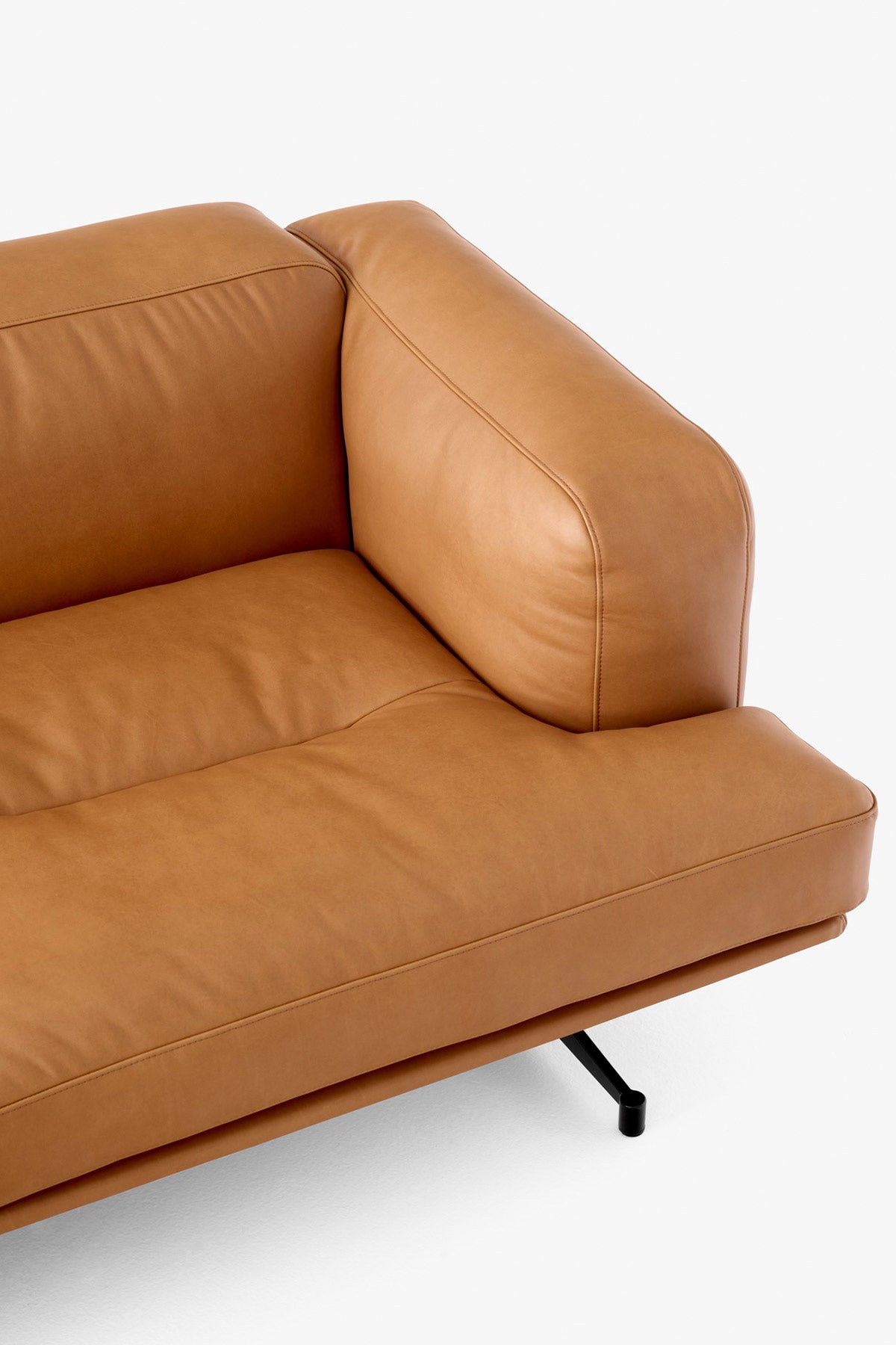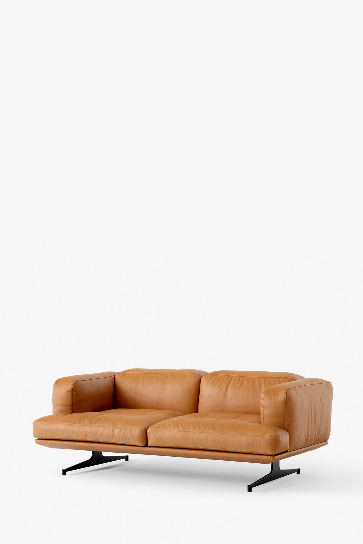 Inland AV22 2-seter sofa, designet av den Oslo-baserte designduoen Anderssen & Voll for &Tradition. Designerne ønsket en sofa som skulle gi masse komfort innenfor et klart definert arkitektonisk rammeverk. Med denne visjonen i tankene, designet de Inland, en lav, dyp sofa med høye armlener og en varm, sort stålfot som gir følelsen av at sofaen svever. Sofaens ramme er laget av massiv bøk og kryssfinér og deretter dekket med HR-skum, dyner og polyestervatt. Metallbena er frest og sveiset og deretter pulverlakkert. Sofaen er trukket i cognacfarget anilin-skinn som vil utvikle en fantastisk patina over tid. Inland finnes også som en romsligere 3-seter og kan bestilles med base i aluminium i stedet for sort, og i et hav av andre stoffer. Kom gjerne innom Bolina for å slå av en prat og kikke på stoffprøver.