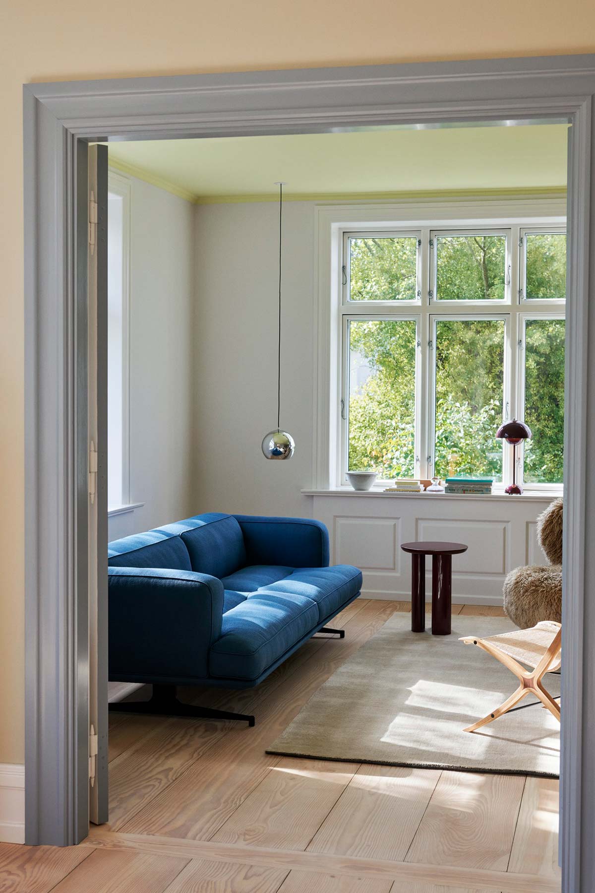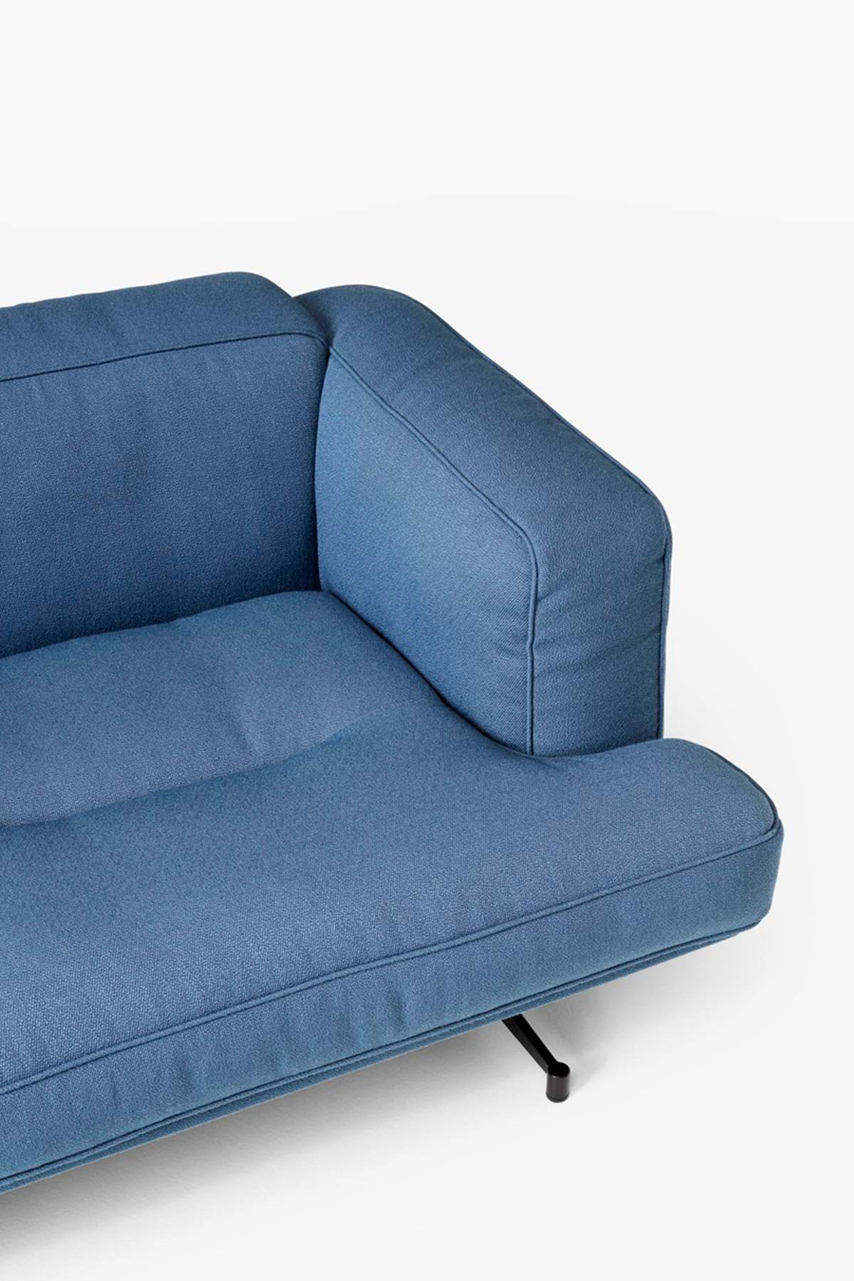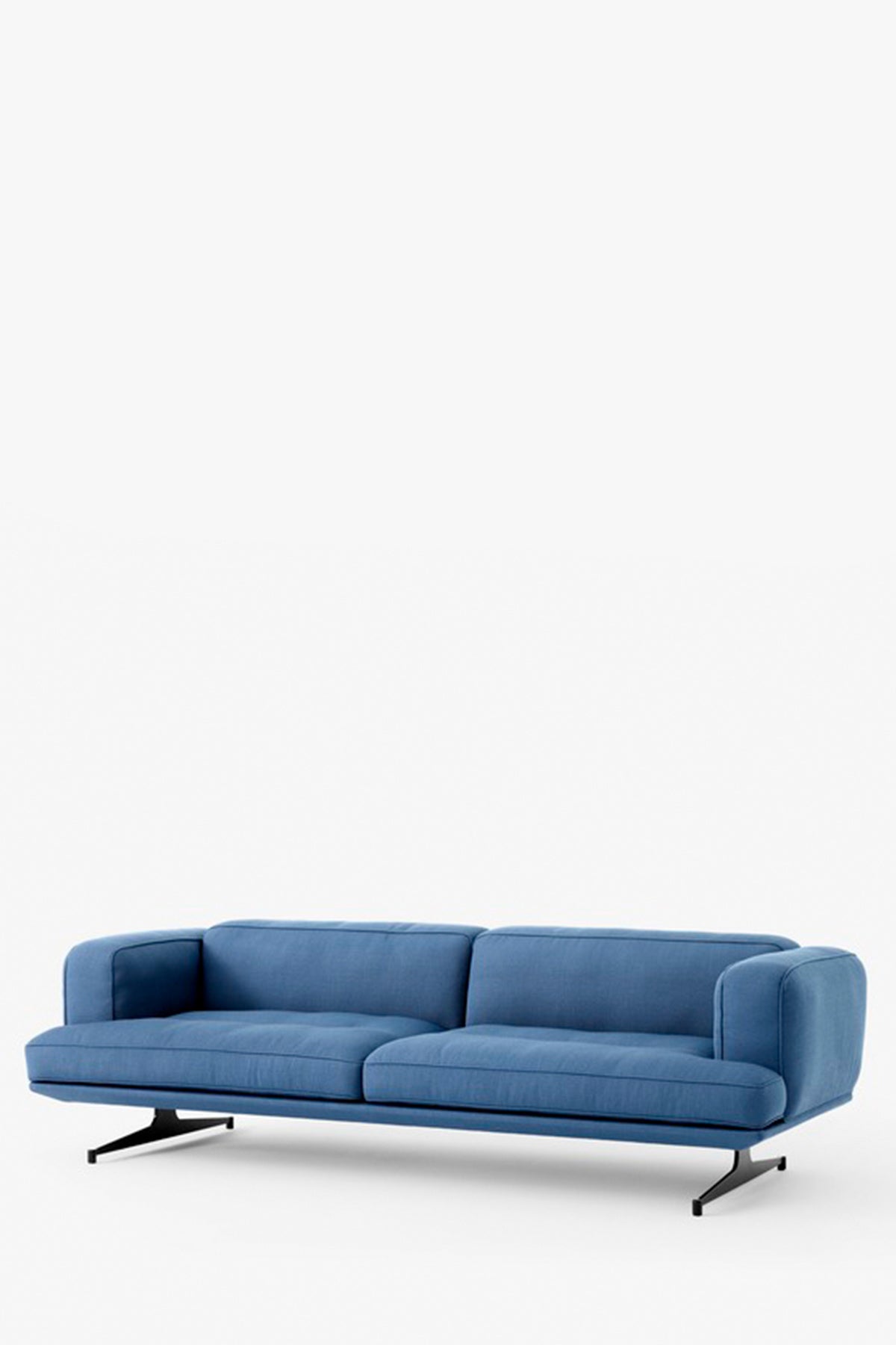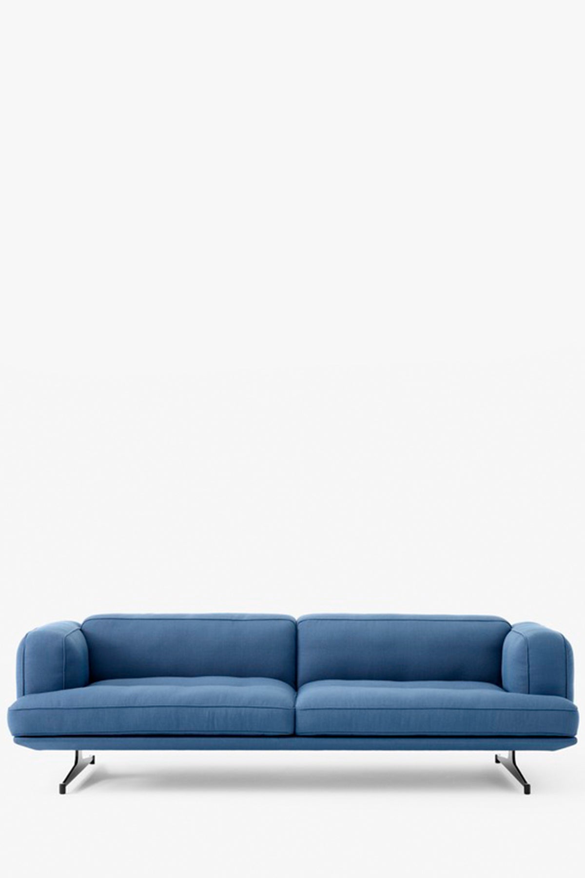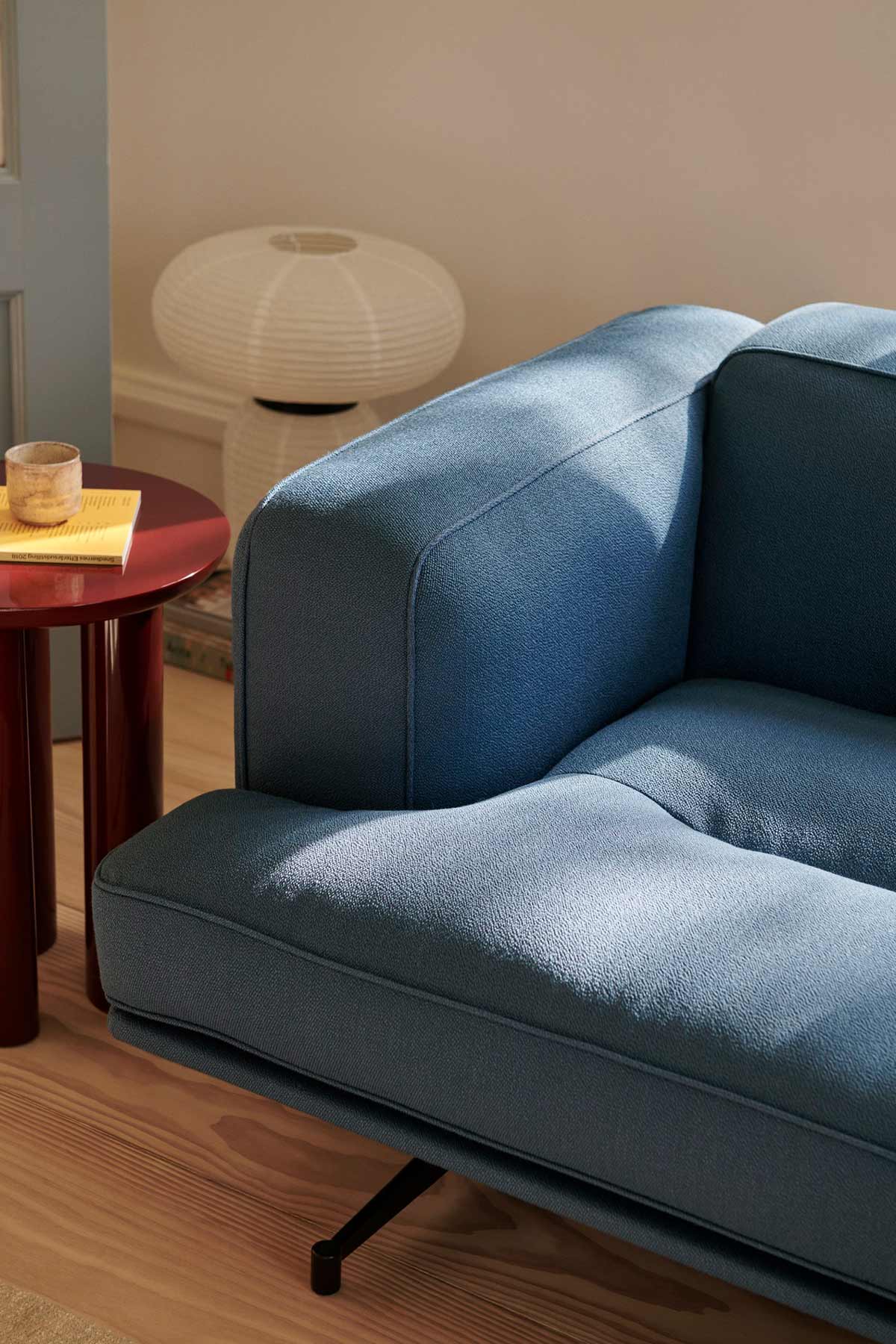 Inland AV23 3-seter sofa, designet av den Oslo-baserte designduoen Anderssen & Voll for &Tradition. Designerne ønsket en sofa som skulle gi masse komfort innenfor et klart definert arkitektonisk rammeverk. Med denne visjonen i tankene, designet de Inland, en lav, dyp sofa med høye armlener og en varm, sort stålfot som gir følelsen av at sofaen svever. Sofaens ramme er laget av massiv bøk og kryssfinér og deretter dekket med HR-skum, dyner og polyestervatt. Metallbena er frest og sveiset og deretter pulverlakkert. Stoffet sofaen er trukket i, Vidar 733 består hovedsakelig av ull med litt nylon. Opprinnelig designet av Fanny Aronsen, har Vidar fått oppdaterte farget av Raf Simons. Stoffet er tettvevd, uten ujevnhetene som andre bouclé-stoffer har og med en innbydende tekstur. Inland finnes også som 2-seter og kan bestilles med base i aluminium i stedet for sort, og i et hav av andre stoffer. Kom gjerne innom Bolina for å slå av en prat og kikke på stoffprøver.