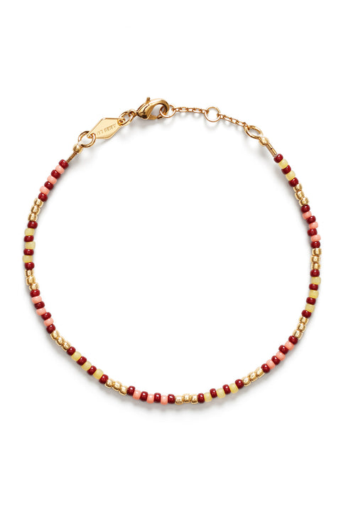 Bundoran armbånd fra Anni Lu. Armbåndet, med sine varme røde og gullfargede perler, skaper et balansert og fargerikt uttrykk som henter inspirasjon fra 70-tallets unike miks av luksus og kreativitet. Club Mirage-kolleksjonen er laget for å fange den livlige energien og bohemske sjarmen fra denne epoken, samtidig som den gir en oppdatert og moderne følelse. Bundoran er et subtilt og levende tilbehør som passer til enhver anledning.