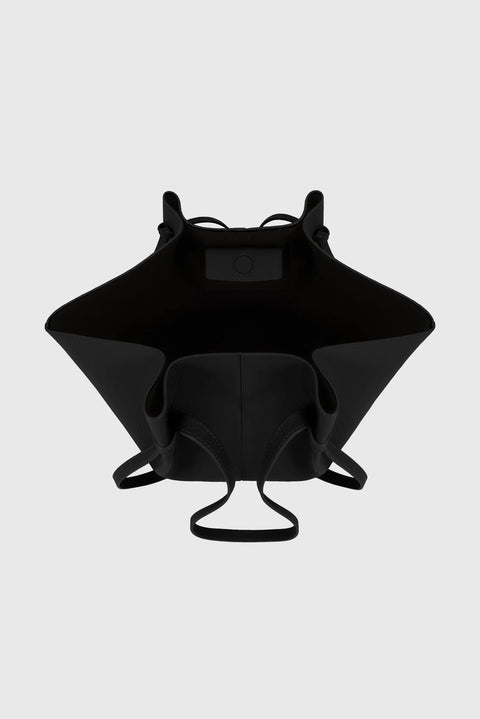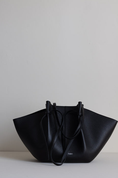 Mochi skulderveske i den største modellen i klassisk glatt sort skinn. Den har de karakteristiske organiske formene, myke folder og knutedetaljer. Vesken er laget av eksklusiv italiensk skinn, og har justerbare stropper som lar deg bære den i hånden eller over skulderen. Den lukkes enkelt med en magnet og har plass til alt du trenger i hverdagen.