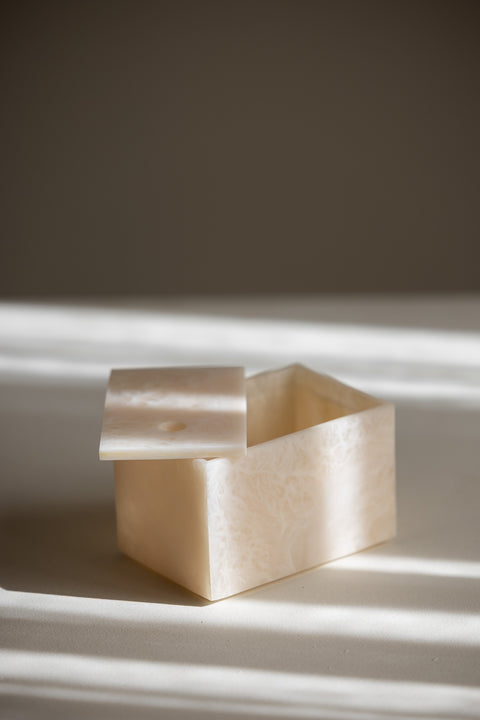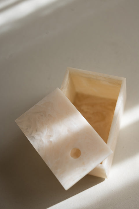 Mist-serien tilbyr en gjennomtenkt kombinasjon av lekne geometriske former og praktisk design. Hver del i denne smarte serien gir deg mulighet til å skape din egen unike kombinasjon med stablebare former. Mist-boksen er laget av en harpiksblanding med flytende, virvlende former og myke fargetoner, noe som gjør hver boks helt unik. Den er perfekt til oppbevaring på badet eller som en liten skattkiste, og lokket legges enkelt på basen med en liten utskjæring for enkel åpning. Mist-boksen finnes i ulike størrelser, selges separat og dekker en rekke oppbevaringsbehov i hjemmet.
