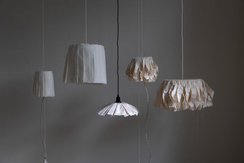 Muffin-taklampen fra spanske Chamusquina har et mykt og poetisk uttrykk, med folder i lyst tekstil som faller naturlig og gir et varmt, dempet lys. Den lette strukturen og ujevne kanten gir lampen en håndlaget følelse som gjør den levende og vakker i både moderne og klassiske rom. Muffin fungerer alene som et blikkfang, men er også nydelig i gruppe over et spisebord eller i en trapp.