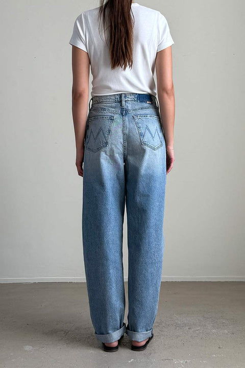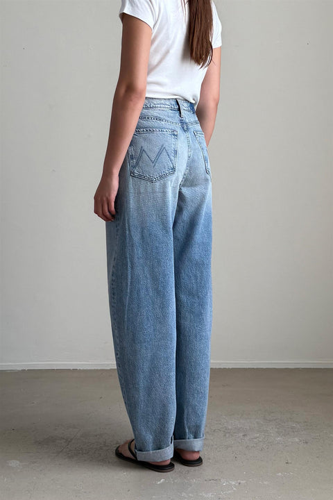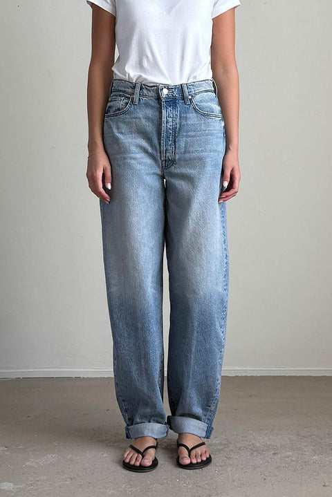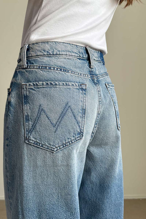 The Fangirl Button Skimp Cuff fra Mother er en high-waisted jeans med bred, avrundet benform og knappelukking. Modellen er laget i 100% rigid bomullsdenim uten stretch, som former seg etter kroppen over tid. Vasken Blinded By The Light er en lys blå tone med lett falming og whiskers over knærne, og gir jeansen en avslappet, vintageinspirert look. Mother kaller det tålmodighetsarbeid – men et som belønnes.