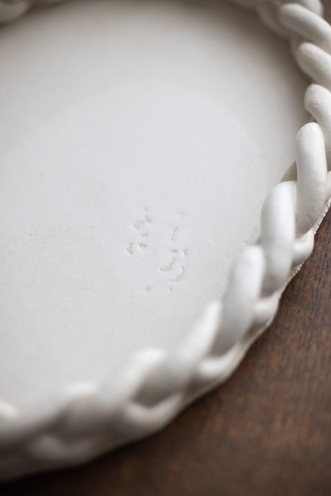 Ovalt vevd brett i hvitt chamotte-steintøy, melkehvit matt emalje.