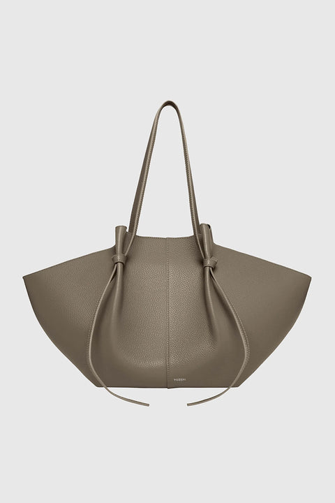 Large Mochi Tote fra Yuzefi er en romslig skulderveske laget i italiensk preget kuskinn i en dempet taupefarge. Designet har myke former, foldede detaljer og justerbar skulderstropp med den karakteristiske knuten. Vesken bæres over skulderen og har plass til alt du trenger i løpet av dagen – inkludert bærbar PC opptil 14 tommer. Håndlaget i Spania med fokus på slitestyrke og kvalitetsmaterialer.