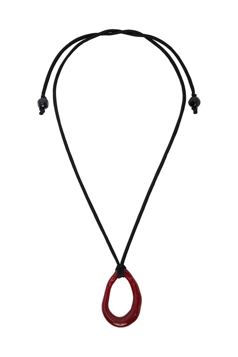 Galatea Caramelo fra Casa Ayllón er et håndlaget smykke med en munnblåst glassring i dyp rød, festet til et sort silkebånd av morbærsilke med små, uregelmessige glassperler i endene. Halskjedet knytes, slik at du kan justere lengden etter ønske. Hver glasspendant er unik, med naturlige variasjoner i form og overflate som følger av det håndverksbaserte uttrykket – noe som gjør hvert smykke helt spesielt. Fordi pendanten er laget av glass, bør den behandles med forsiktighet.