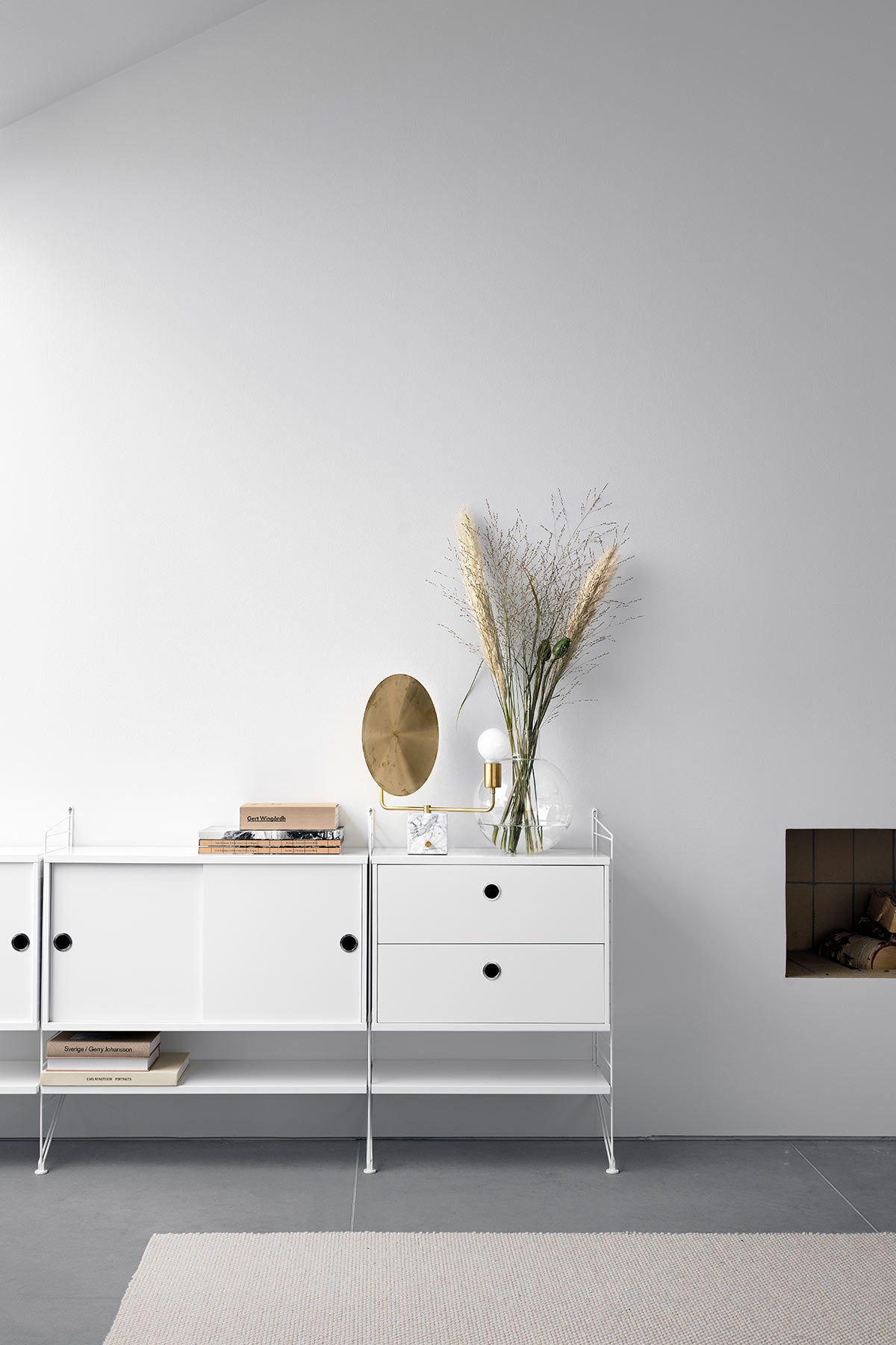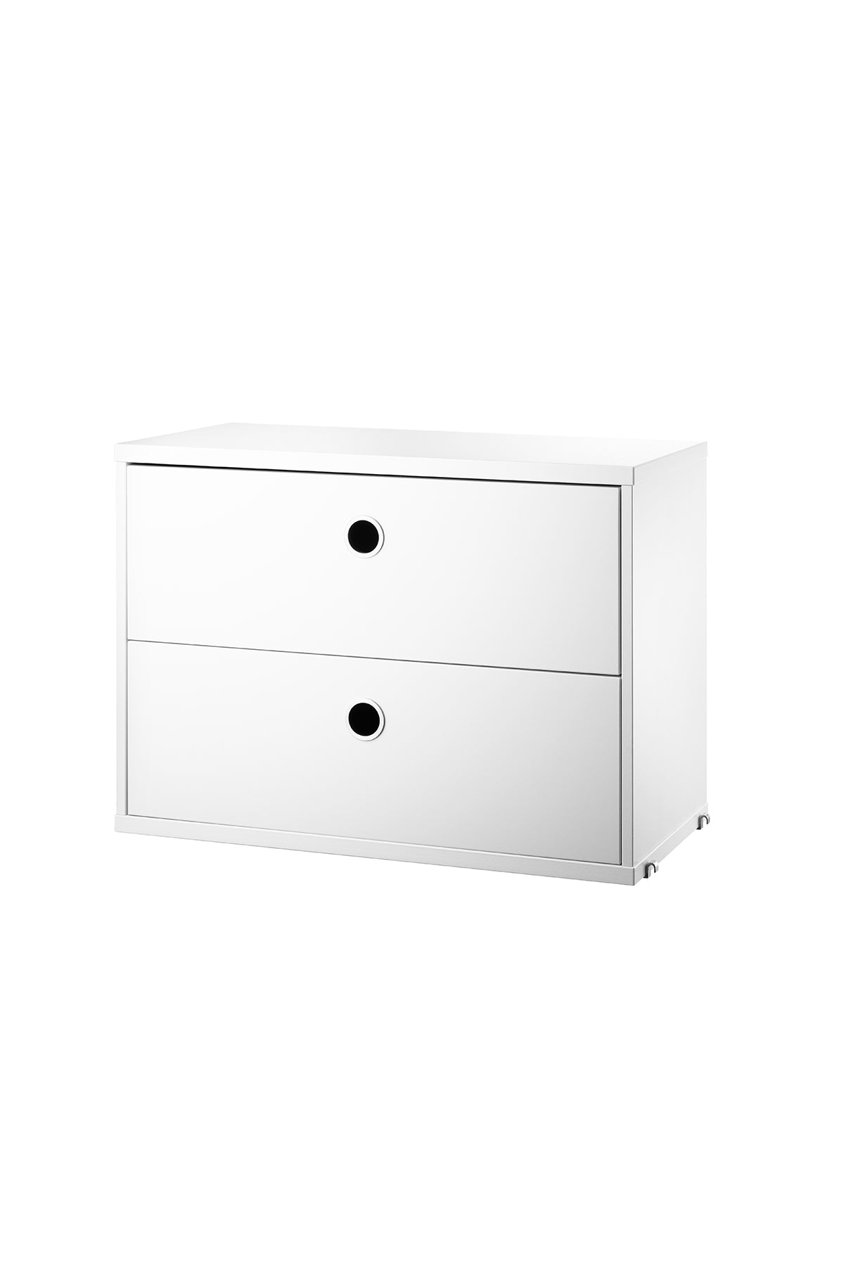 Skuffeseksjon med to skuffer selges som en enkeltdel av String System og fås i to bredder, 78 cm og 58 cm, og en dybde på 30 cm. Skuffene passer med alle string- og plex-gavler fra String® System, forutsatt at gavlene er 30 cm dype. De er designet med to uttrekkbare skuffer, noe som gjør dem optimale for skjult oppbevaring. Skuffene passer i hallen så vel som i stuen eller barnerommet.