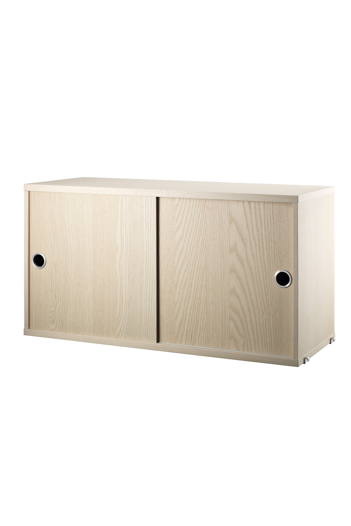 Skap med skyvedører selges som en enkeltdel du praktisk kan kombinere i ditt String® System. Skapet fåes i en bredde på 78cm og to dybder, 30 og 20 cm. Visuelt er det fint å bryte med et større element i stringhyllen, samtidig som det er superpraktisk til oppbevaring og lagring. Skapet består av en skillevegg i midten og to indre hyller som kan justeres etter behov. Leveres med opphengsbeslag i pakken.