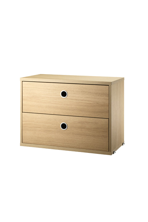 Skuffeseksjonen med to skuffer selges som en enkeltdel av String System og fås i to bredder, 78 cm og 58 cm, og en dybde på 30 cm. Skuffene passer med alle string- og plex-gavler fra String® System, forutsatt at gavlene er 30 cm dype. De er designet med to uttrekkbare skuffer, noe som gjør dem optimale for skjult oppbevaring. Skuffene passer i hallen så vel som i stuen eller barnerommet.
