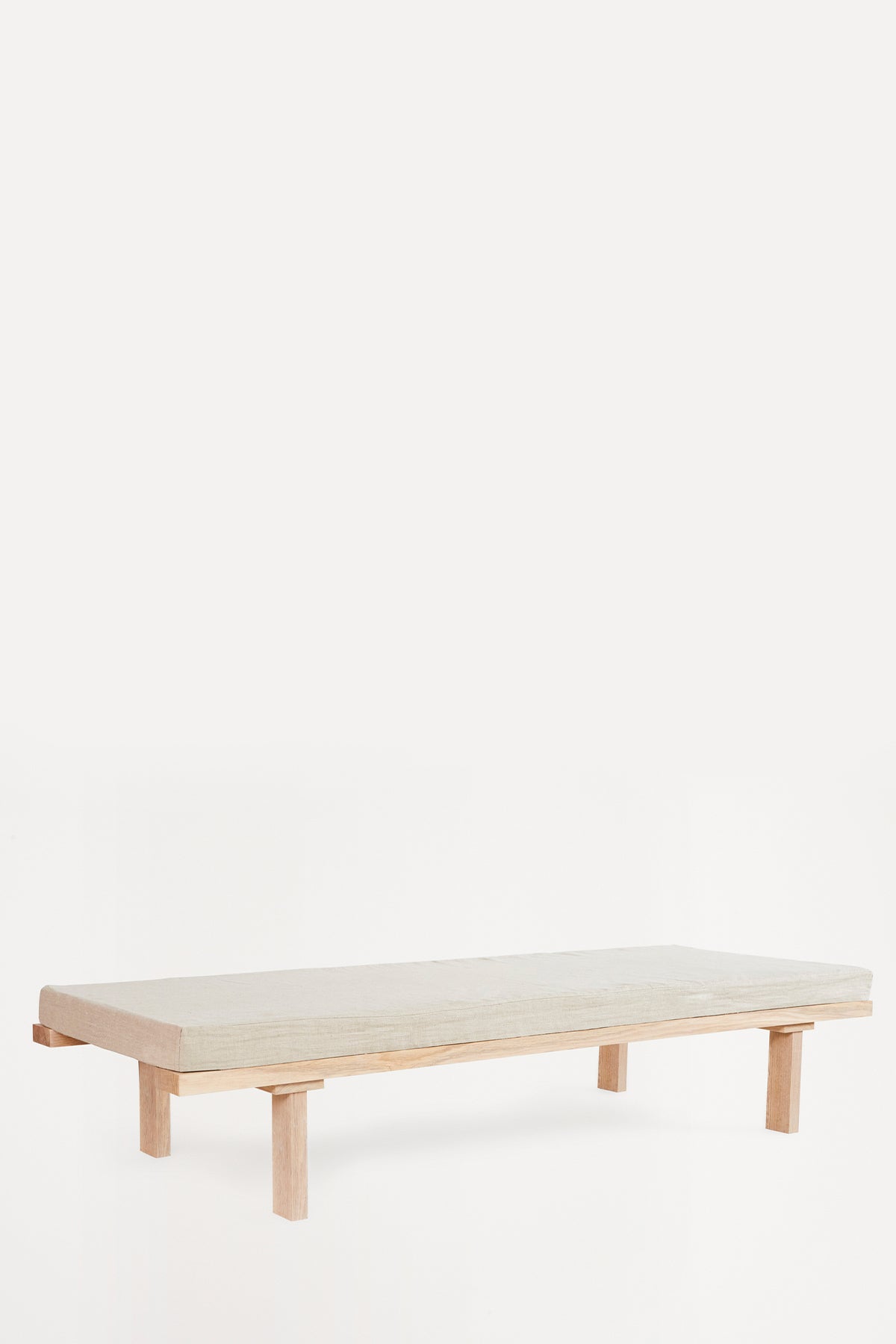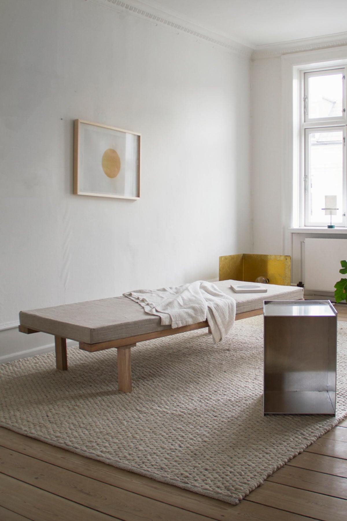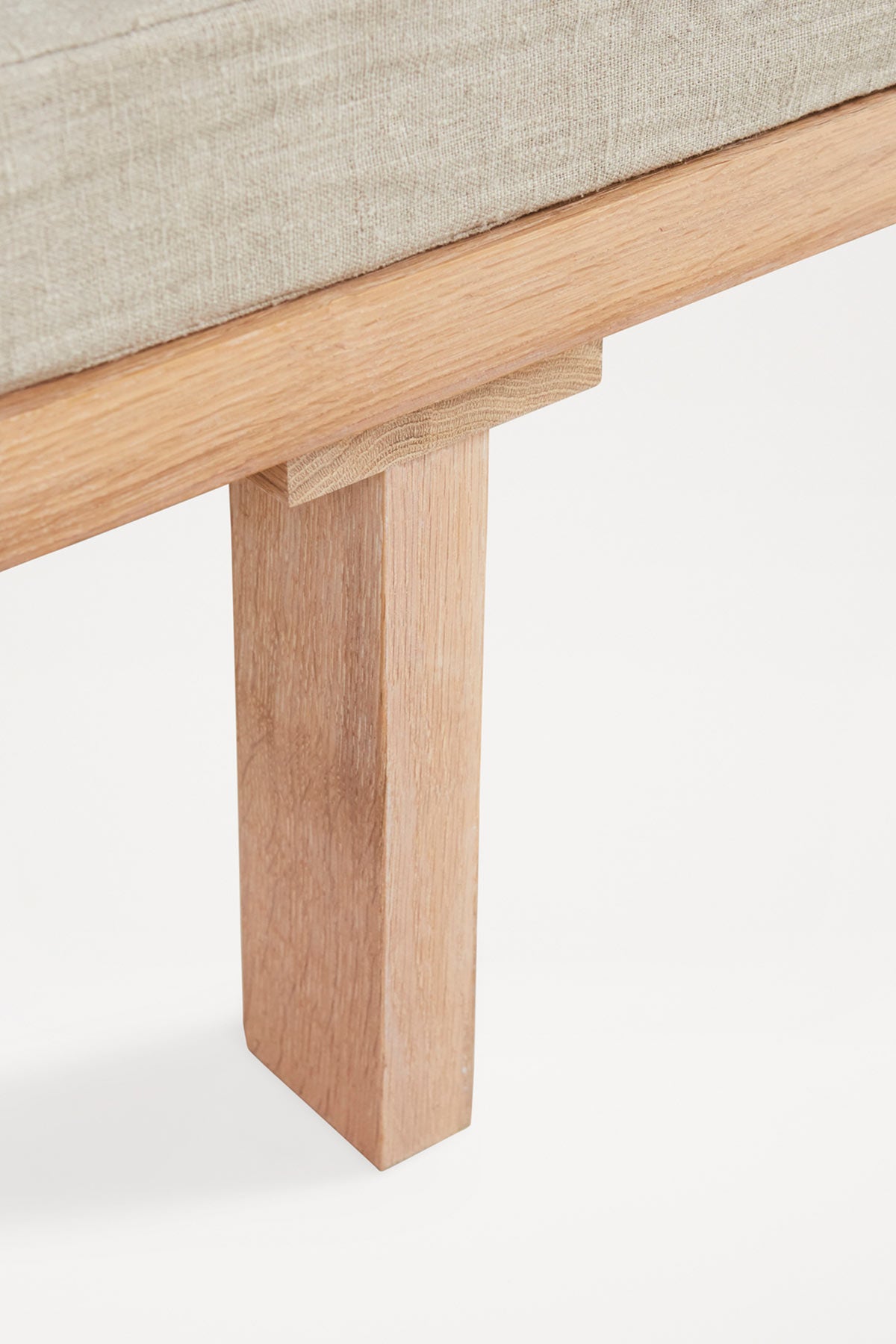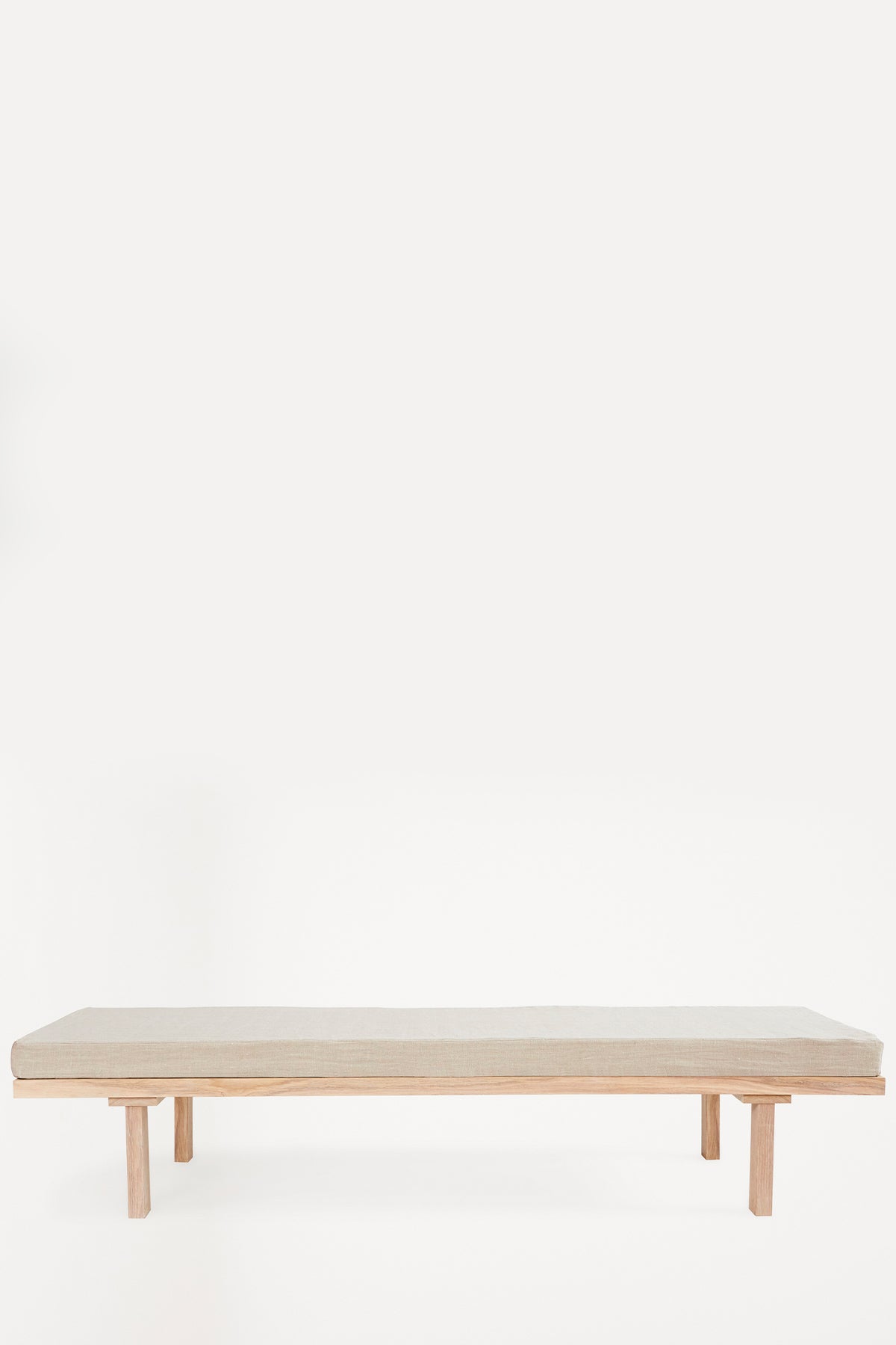 Daybed fra danske Frama, designet av Kim Richardt med ramme i solid, oljet eik og myk madrass med trekk i 100% lin. KR-180 har et stilrent uttrykk, - et møbel som bruker de enkle kontrastene til vertikale og horisontale linjer for å skape en strukturelt ren form. Uttrykket mykes opp med den komfortable tre-lags skummadrassen med lysegrått trekk i eksklusiv lin. KR-180 kommer flatpakket og er enkel å montere uten ekstra verktøy. Perfekt i stuen eller som en ekstra gjesteseng.