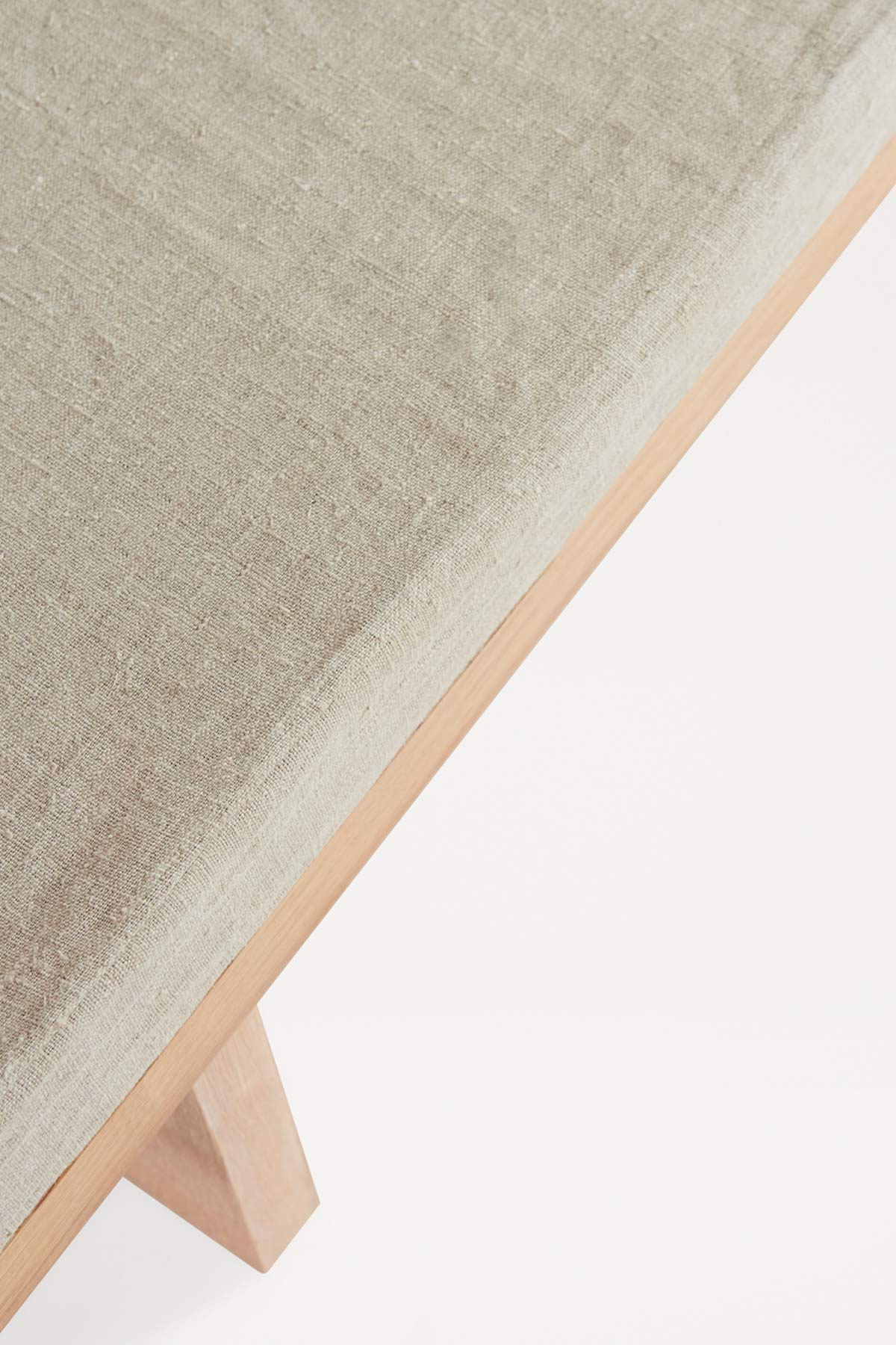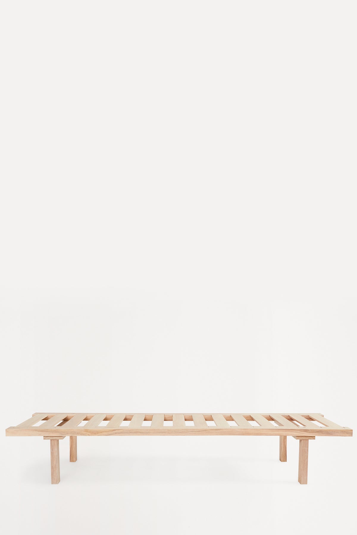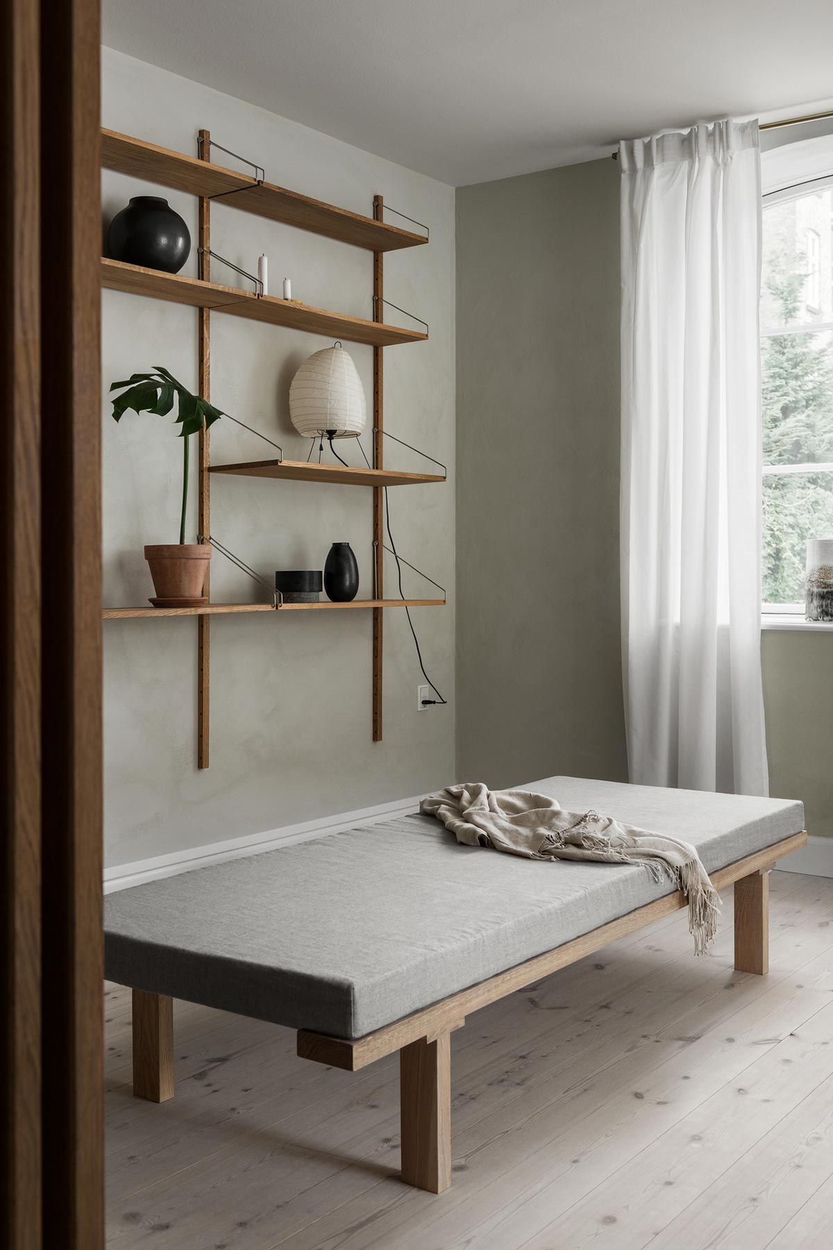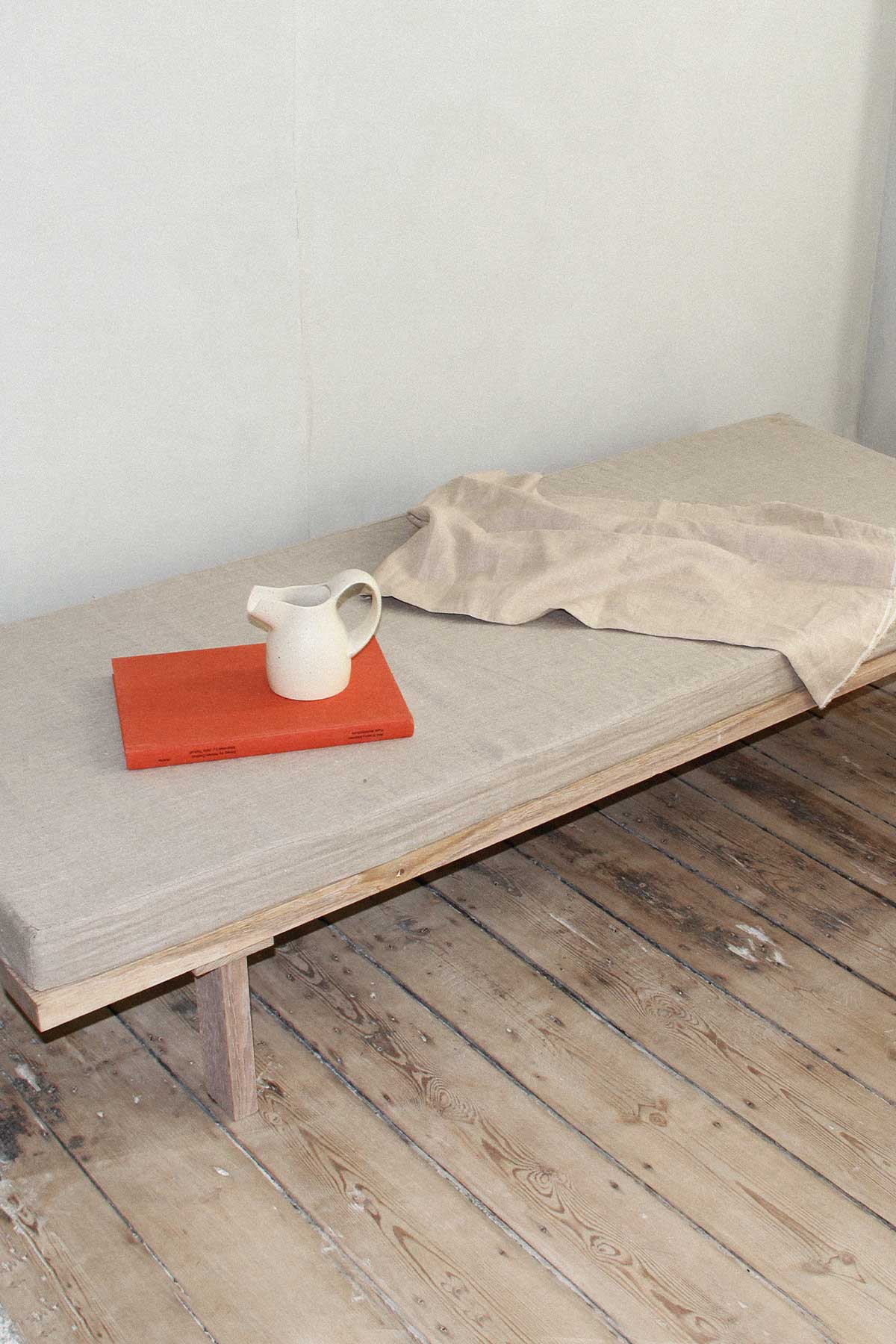 Daybed fra danske Frama, designet av Kim Richardt med ramme i solid, oljet eik og myk madrass med trekk i 100% lin. KR-180 har et stilrent uttrykk, - et møbel som bruker de enkle kontrastene til vertikale og horisontale linjer for å skape en strukturelt ren form. Uttrykket mykes opp med den komfortable tre-lags skummadrassen med lysegrått trekk i eksklusiv lin. KR-180 kommer flatpakket og er enkel å montere uten ekstra verktøy. Perfekt i stuen eller som en ekstra gjesteseng.