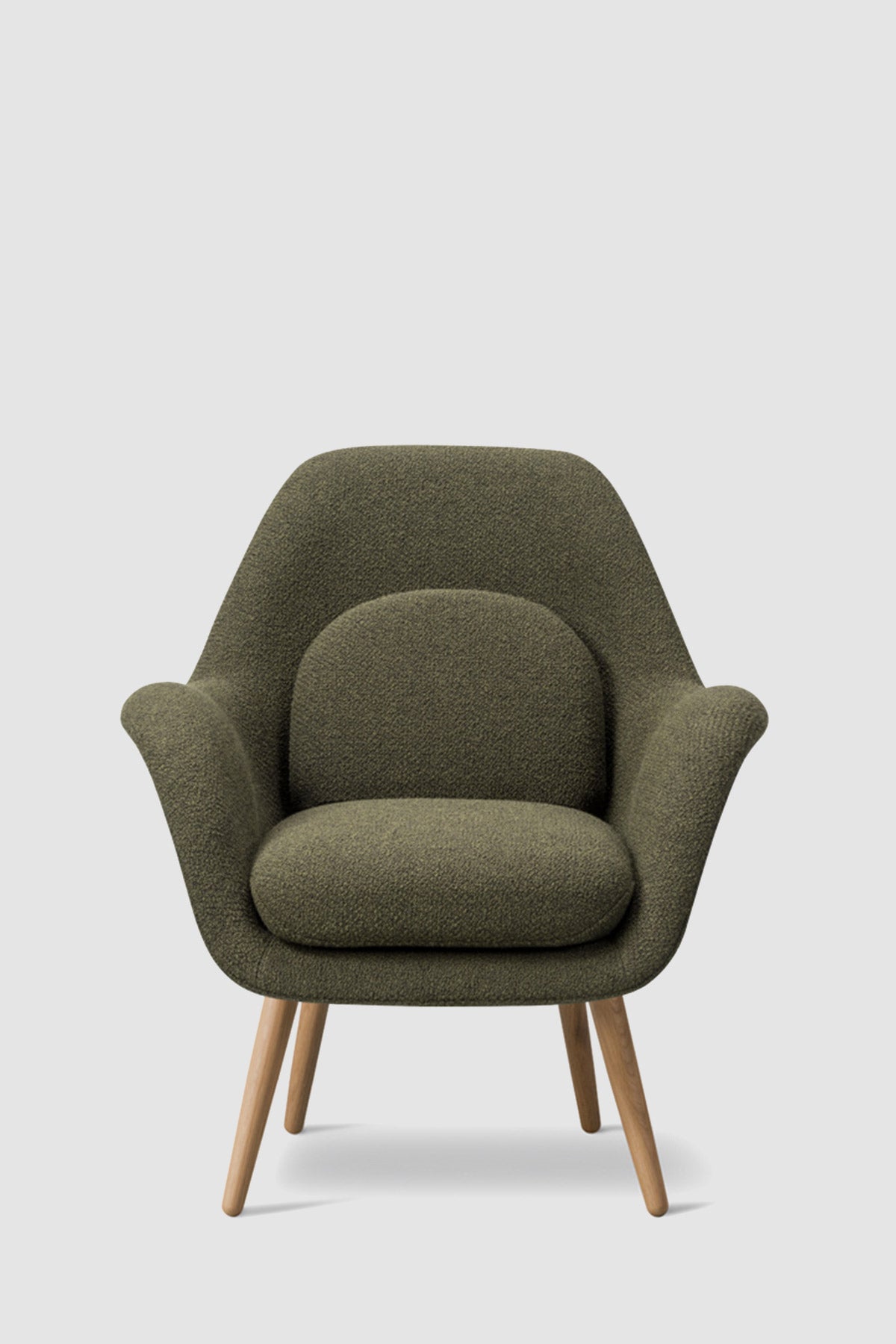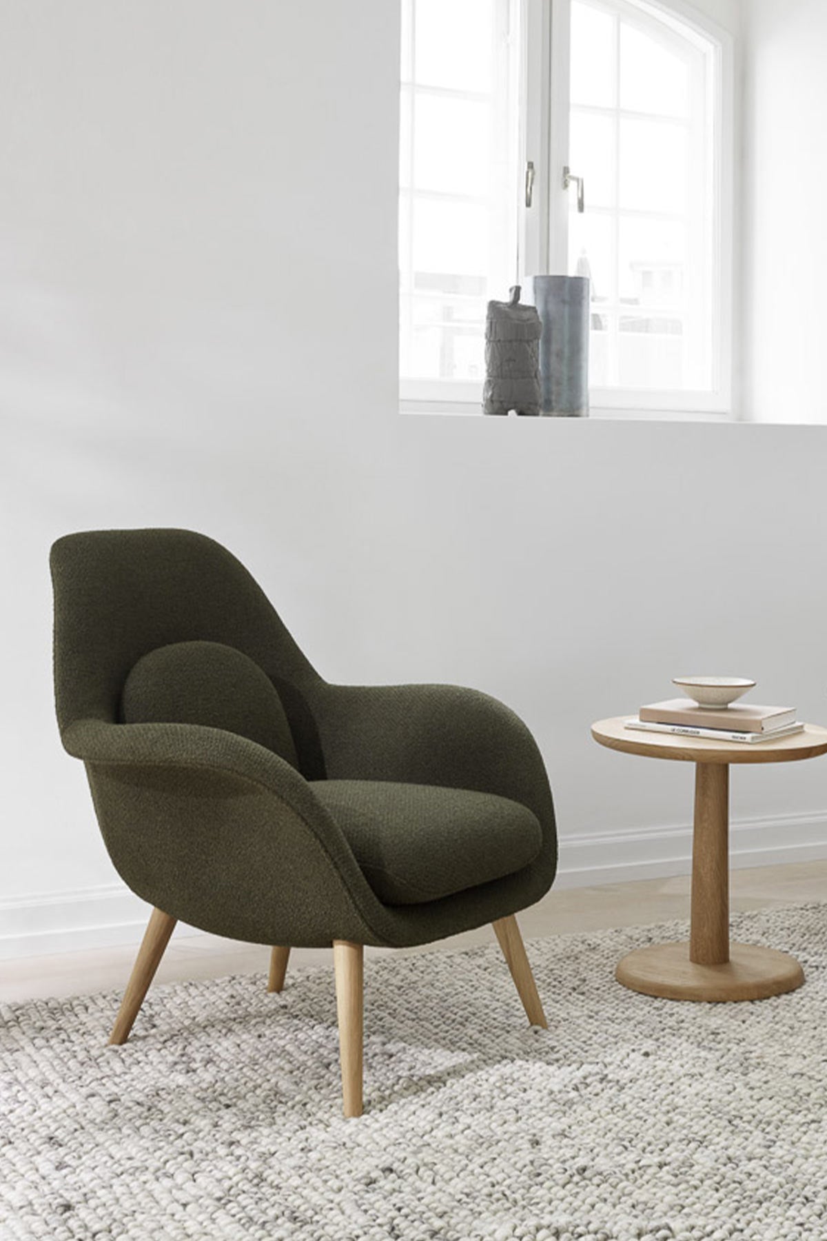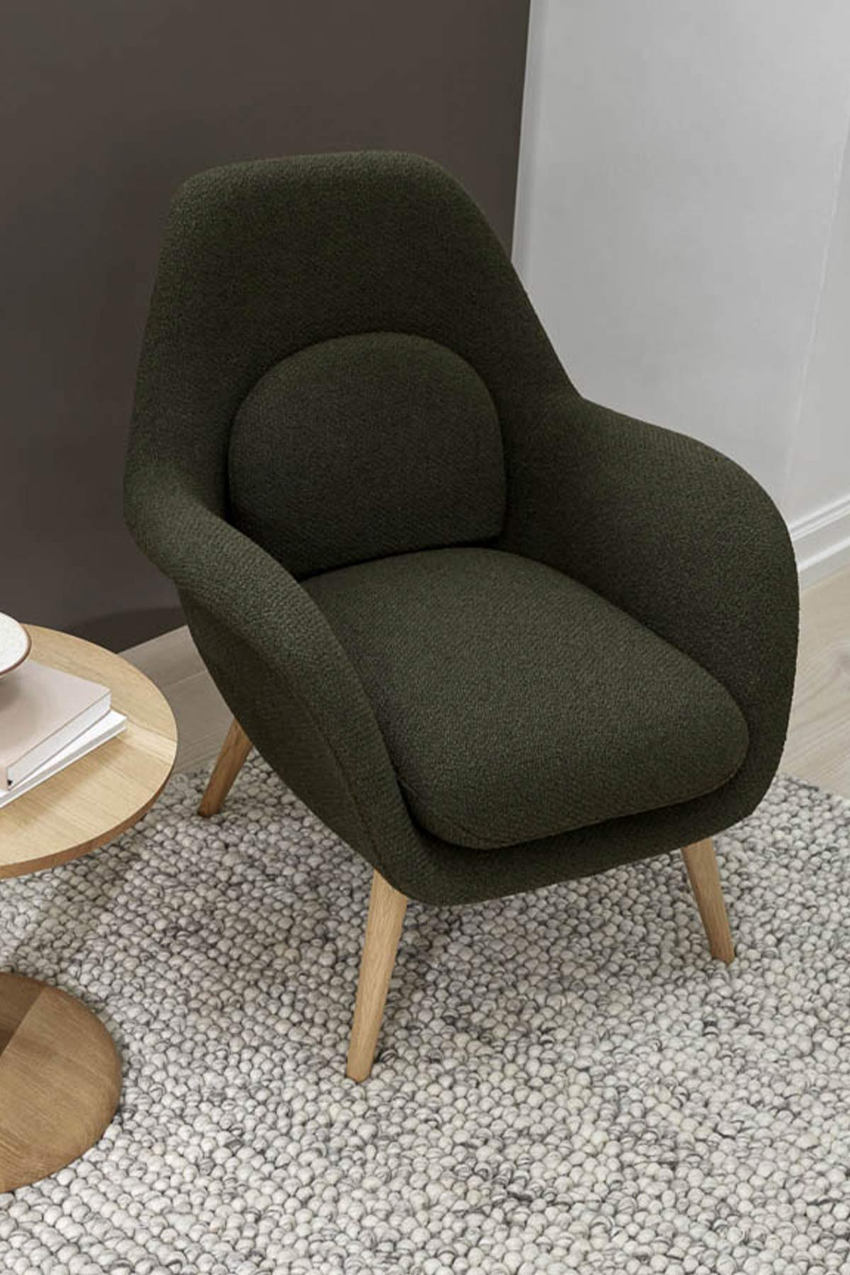 Swoon Petite 1774 lenestol fra Fredericia med base av valnøtt. Utført i det eksklusive stoffet Carlotto 900, et slitesterkt og ultramykt tekstil i mørkegrønn ullblanding med himmelsk bouclé tekstur. Med det enestående trekket som smelter sammen armlenene, setet og ryggen, i tillegg til støttende, myke puter, har du en moderne og skulpturell stol som passer i alle hjem. Swoon Lounge Petit er en nettere og hakket mer oppreist versjon av sin ikoniske forgjenger Swoon Lounge. Petite versjonen inviterer til total avslapning med sitt imøtekommende design og optimale sittekomfort med god ryggstøtte. Dette er en skandinavisk klassiker du vil få glede av i mange år fremover. I tillegg til diverse tekstiler kan du velge mellom base i flere materialer og stiler. Kom gjerne innom Bolina på Stabekk, hvor vi står klare med tekstilprøver og kan hjelpe deg med å designe din helt egen ‘drømme Swoon’.
