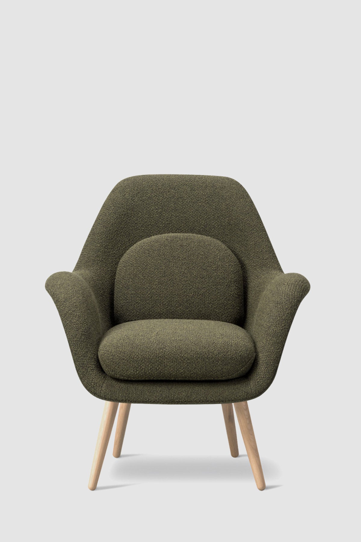 Swoon Petite 1774 lenestol fra Fredericia med ben i såpet eik. Utført i det eksklusive stoffet Carlotto 900, et slitesterkt og ultramykt tekstil i mørkegrønn ullblanding med himmelsk bouclé tekstur. Med det enestående trekket som smelter sammen armlenene, setet og ryggen, i tillegg til støttende, myke puter, har du en moderne og skulpturell stol som passer i alle hjem. Swoon Lounge Petit er en nettere og hakket mer oppreist versjon av sin ikoniske forgjenger Swoon Lounge. Petite versjonen inviterer til total avslapning med sitt imøtekommende design og optimale sittekomfort. Dette er en skandinavisk klassiker du vil få glede av i mange år fremover. I tillegg til diverse tekstiler kan du velge mellom base i oljet eik, såpet eik, valnøtt, sort stål og krom. Kom gjerne innom Bolina på Stabekk, hvor vi står klare med tekstilprøver og kan hjelpe deg med å designe din helt egen ‘drømme Swoon’.