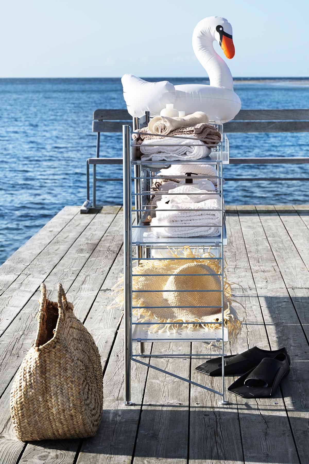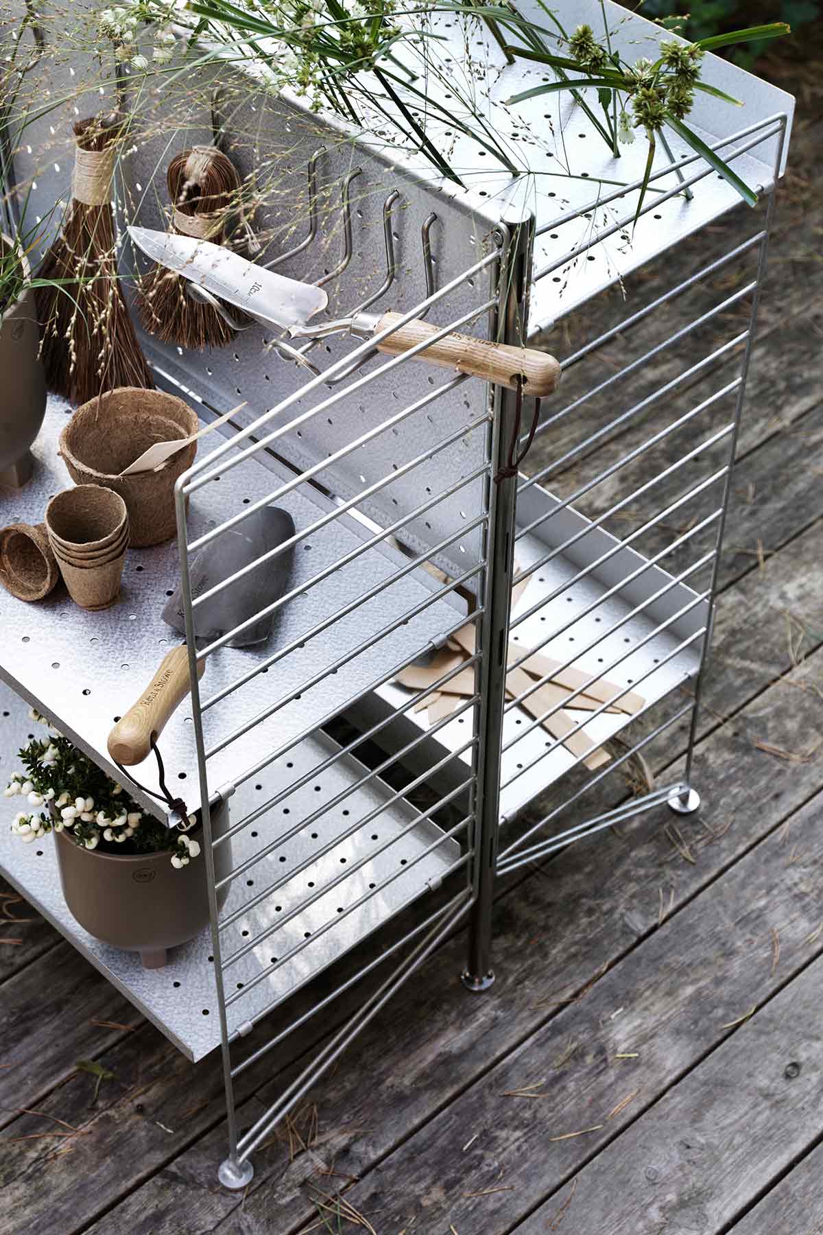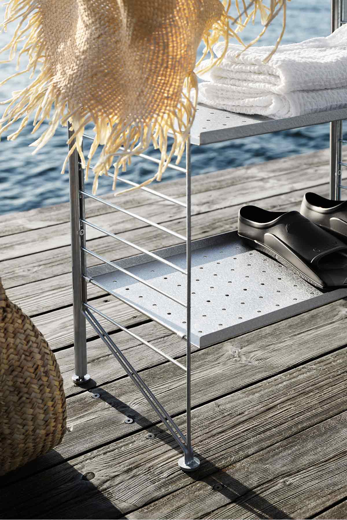 Stolpen er en del av den frittstående utendørshyllen til String, laget av galvanisert stål. Stolpens diameter er 2 cm og høyden er 87 cm der foten er justerbar. For en komplett del av den frittstående hyllen kreves en bakplate, to stolper og to galvaniserte gulvgavler med en høyde på 85 cm og en dybde på 30 cm. For å bygge flere seksjoner trenger du et ekstra innlegg og en ekstra gavel per seksjon. For en kombinasjon bestående av tre seksjoner, anbefales minst en bakplate som med fordel plasseres i midten.
