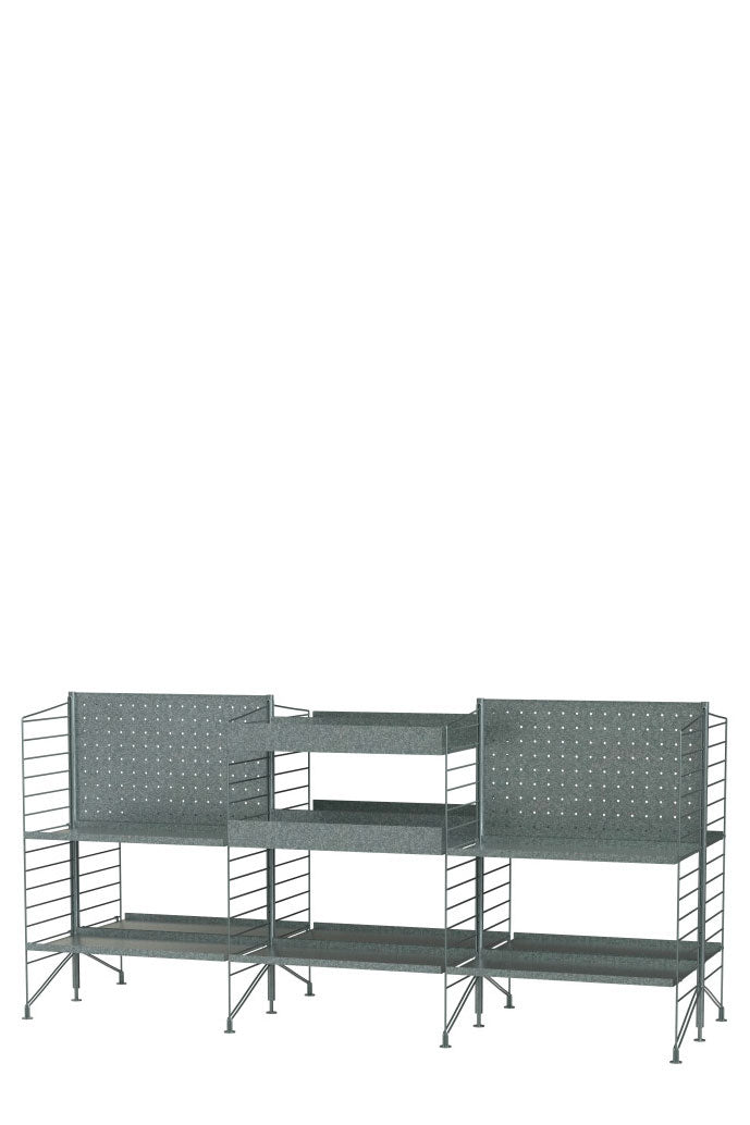 Outdoor N er en frittstående ferdigkomponert hylle med hylleplater på begge sider. Hyllen har en praktisk kombinasjon av hylleplater med høy og lav kant som gir både variasjon og større oppbevaringsmuligheter. De galvaniserte hyllene fra String er laget spesielt for utendørs bruk, og vil over tid utvikle en fin patina.