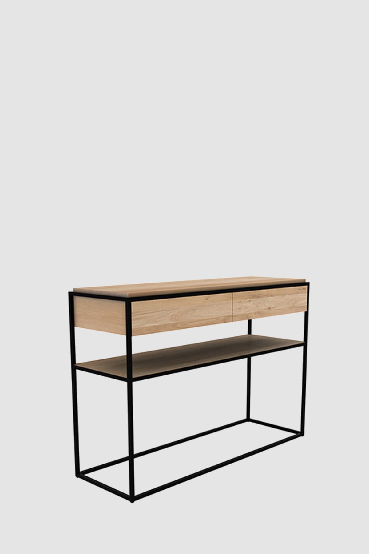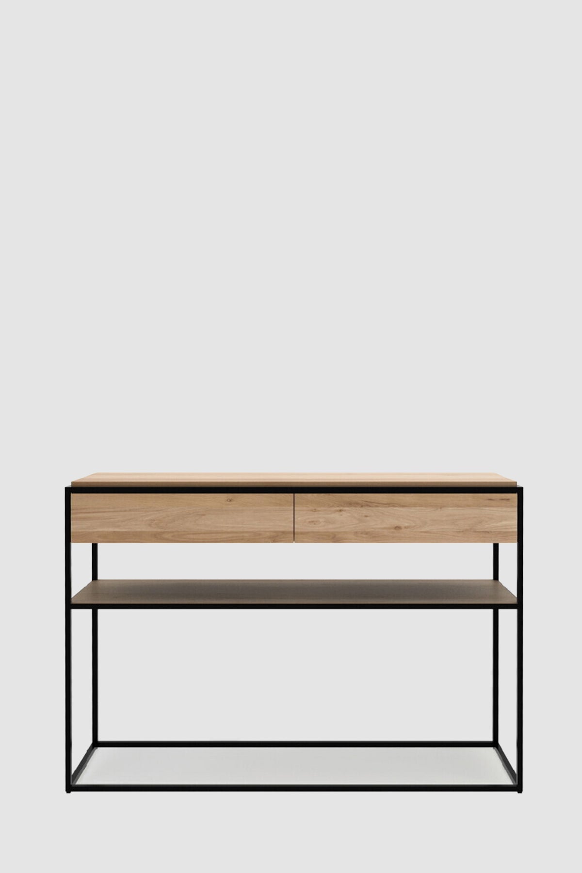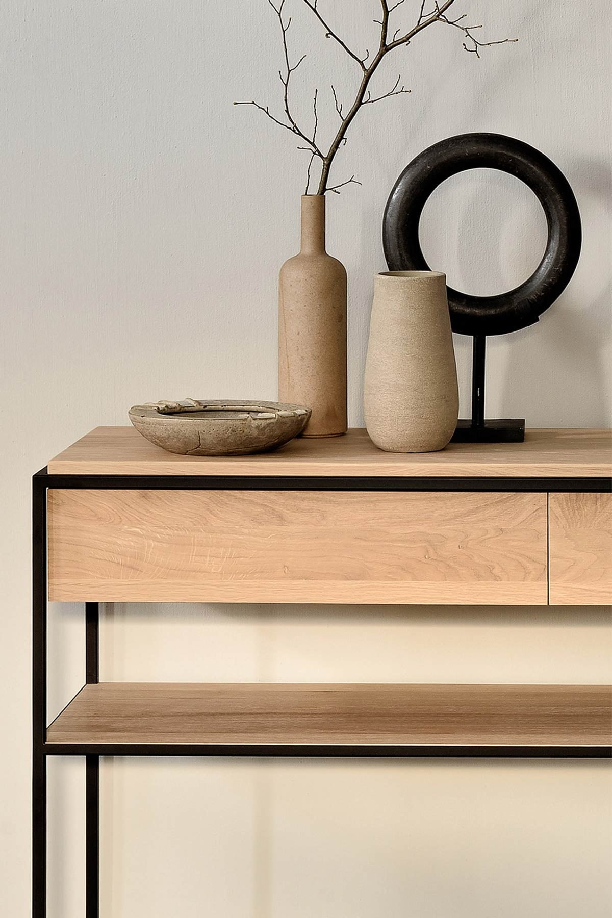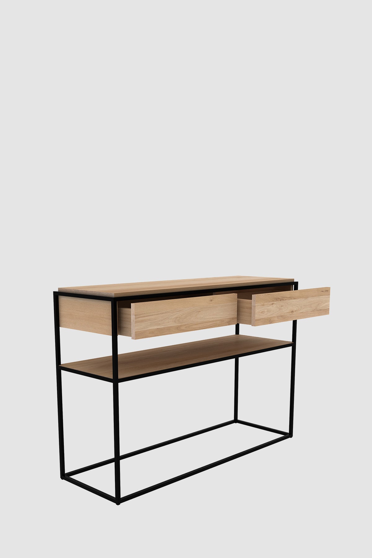 Monolit konsollbord i oljet eik fra belgiske Ethnicraft. Konsollbordet har to praktiske skuffer og en åpen hylle under slik at du både kan gjemme bort gjenstander og vise frem utvalgte favoritter. Konsollbordet har et stramt design som fusjonerer balanse og funksjonalitet ved å kombinere motstridende elementer i lun, oljet eik med ramme i sort pulverlakkert stål. Monolit kan brukes som et sidebord eller avlastningsbord i gangen, stua eller på soverommet og er laget av høykvalitets, europeisk eik. Ethnicraft lar materialet komme til sin rett ved å la de naturlige variasjonene og teksturene i treet være synlige. Konsollbordets kombinasjon av moderne design, sterke konstruksjon og varige materialer gjør det til den ideelle oppbevaringsløsningen for alle hjem.