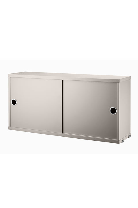 Skap med skyvedører selges som en enkeltdel du praktisk kan kombinere i ditt String® System. Skapet fåes i en bredde på 78cm og to dybder, 30 og 20 cm. Visuelt er det fint å bryte med et større element i stringhyllen, samtidig som det er superpraktisk til oppbevaring og lagring. Skapet består av en skillevegg i midten og to indre hyller som kan justeres etter behov. Leveres med opphengsbeslag i pakken.