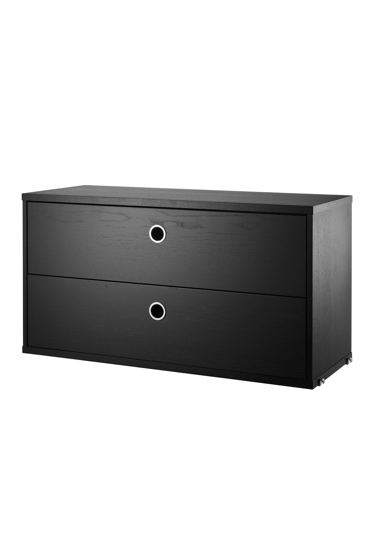 Skuffeseksjon med to skuffer selges som en enkeltdel av String System og fås i to bredder, 78 cm og 58 cm, og en dybde på 30 cm. Skuffene passer med alle string- og plex-gavler fra String® System, forutsatt at gavlene er 30 cm dype. De er designet med to uttrekkbare skuffer, noe som gjør dem optimale for skjult oppbevaring. Skuffene passer i hallen så vel som i stuen eller barnerommet.