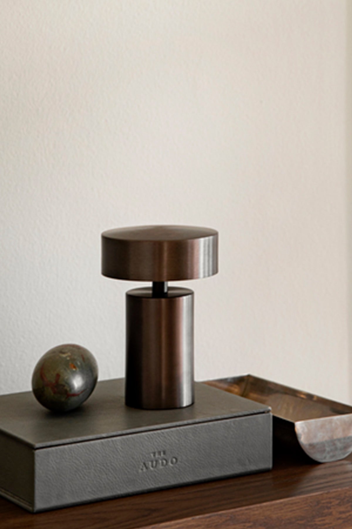 Bli kjent med Column Portable bordlampe; en nett og stilig lampe til inne-eller uterom. Formen på Column er inspirert av pullertene som brukes til å feste fartøyer til en brygge, og kombinerer bærbar teknologi og stemningsskapende lys i en slående soppaktig form. Lampen er batteridrevet som gir maks frihet og fleksibilitet, samtidig som 3-step dimmeren gjør at du kan justere lysstyrken og få akkurat det stemningsfulle lyset du ønsker. Den trådløse bordlampen lades via en skjult USB-kontakt (som passer til standard stikkontakt) ved basen og er også kompatibel med ladebrettet fra samme merke. Lett og slitesterk, med en vakker fargefinish i enten bronzed brass eller børstet aluminium, er dette et design du vil bruke på alle favorittstedene dine. La den lyse opp på et sidebord, i bokhylla, på nattbordet eller ute på terrassen eller balkongen. Denne vil du ha mye glede av!