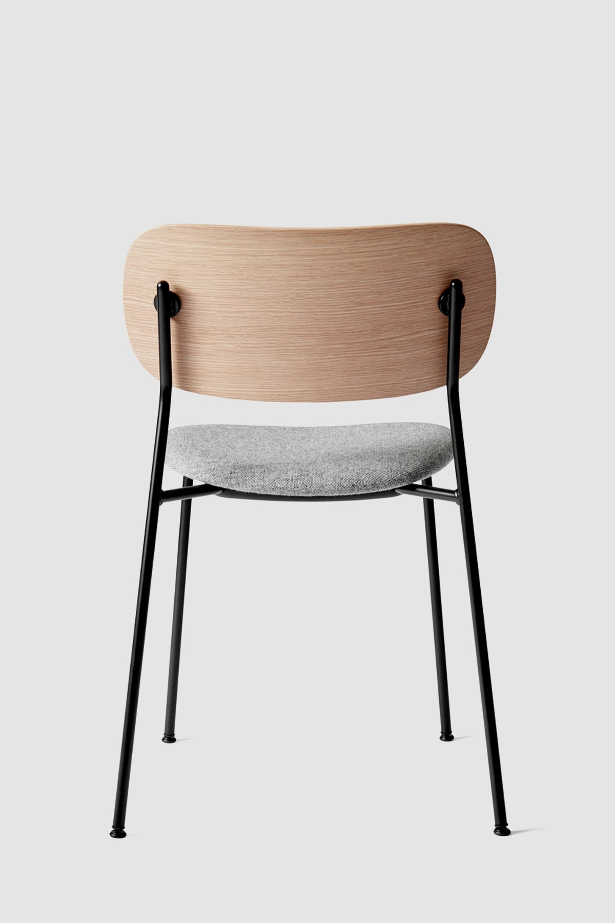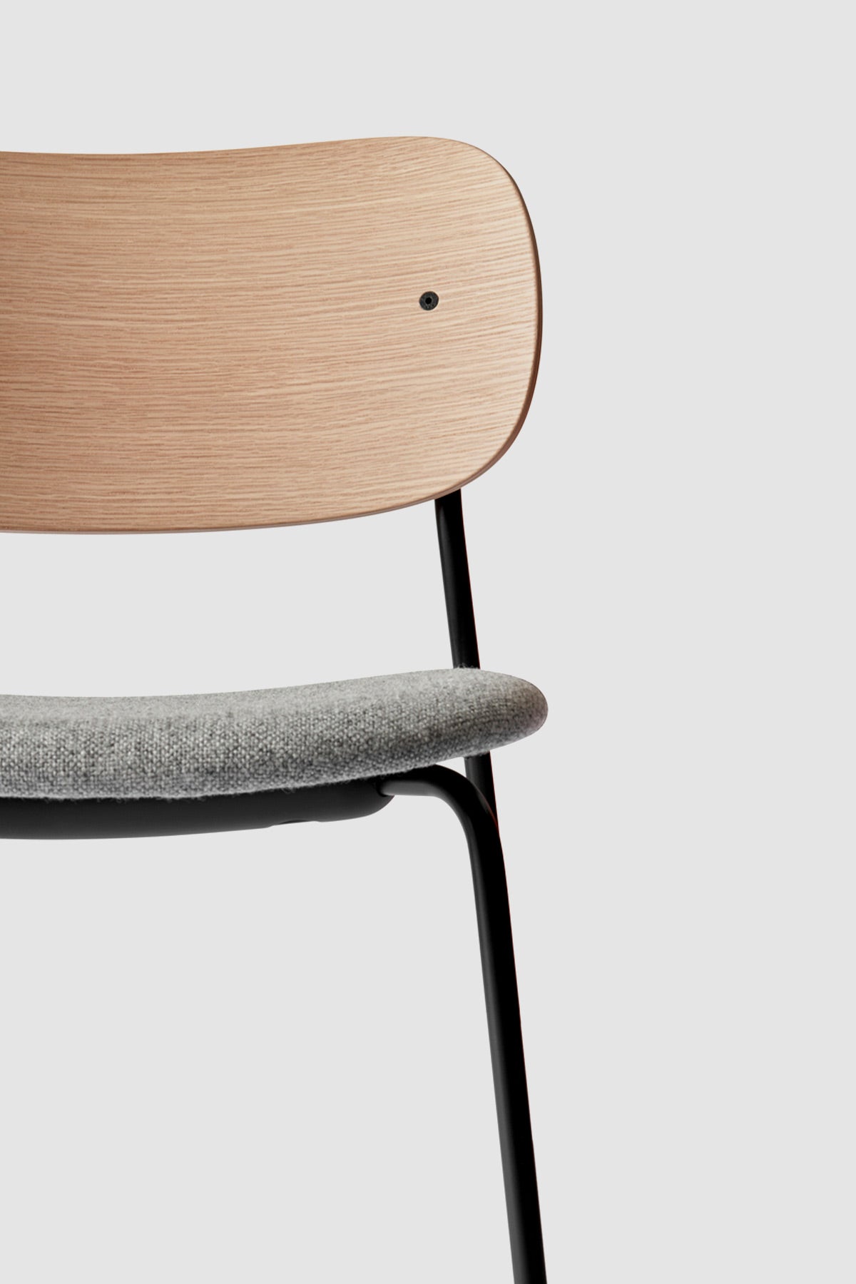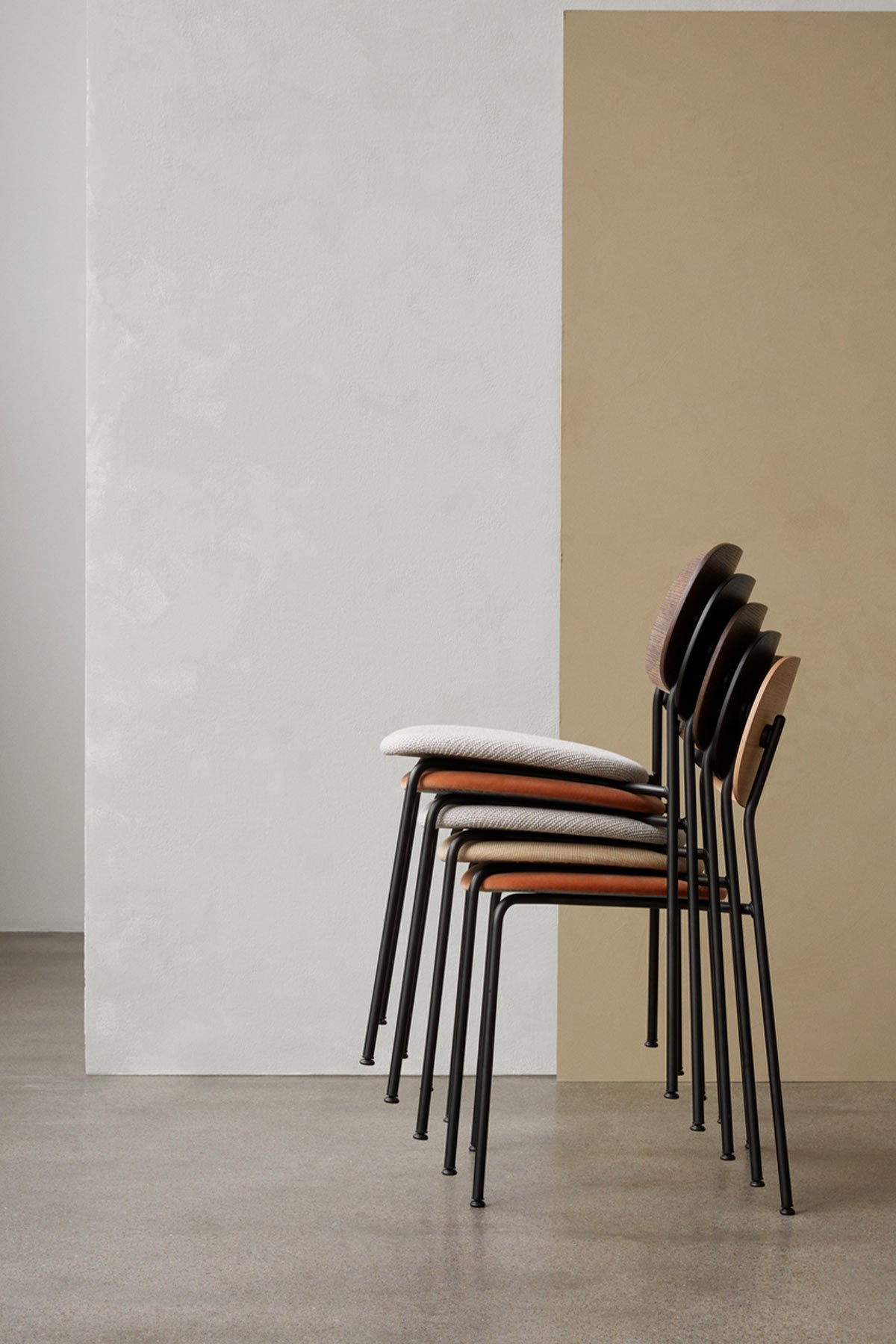 Co Dining Chair, designet av Norm Architects og Els van Hoorebeeck for Audo Copenhagen. Co Dining Chair kombinerer en lett, minimalistisk profil, varme materialer og god sittekomfort pluss muligheten til å stable opptil 10 stoler i et kompakt tårn som gjør den ekstra praktisk. Designets allsidighet er resultatet av en gjennomtenkt konstruksjon og et bredt utvalg av materialer: med mange finérfinisher og møbeltrekk å velge mellom, er Co Dining Chair lett å tilpasse deg og dine behov. Stolens proporsjoner utmerker seg med en bred finérrygg som gir eksepsjonell støtte, og gir samtidig bevegelsesfrihet og maksimal sittekomfort. Sete og rygg er laget av buet kryssfiner, mens kjernen er laget av bøkefinér med ytterlag av eikefinér. Dobbeltlags-skum brukes i polstrede seter for ekstra komfort. Stolens base er laget av bøyd MIG+TIG-sveiset stålrør og armlener fra stålstenger, enten i sort, pulverlakkert stål eller i forkrommet stål. Co Dining Chair finnes med og uten polstring i sete/rygg, med og uten armlene, i lys, mørkebrun eller sort eikefinér, med sort eller krom base, og i utallige materialkombinasjoner. Kom innom oss for å se på materialprøver og få hjelp til å designe din drømmestol.