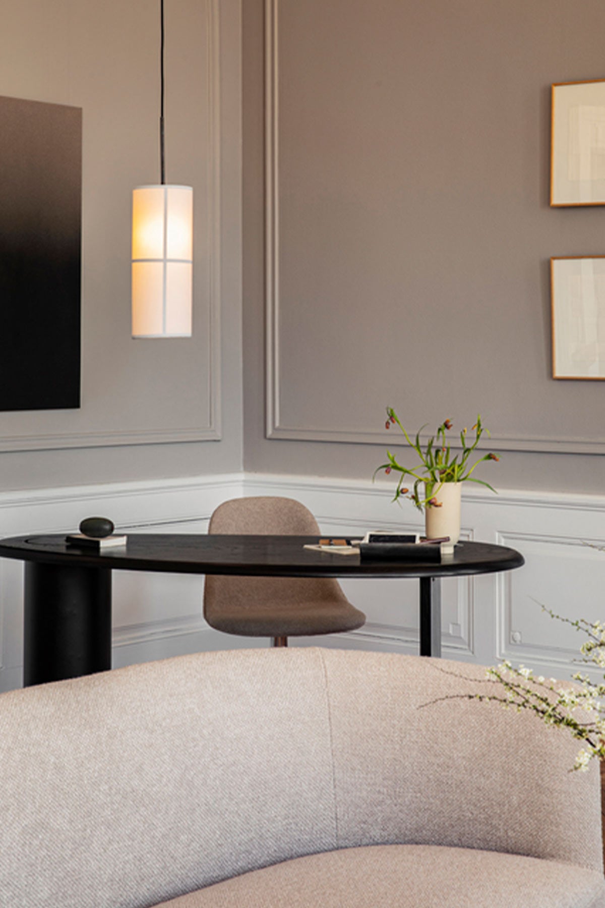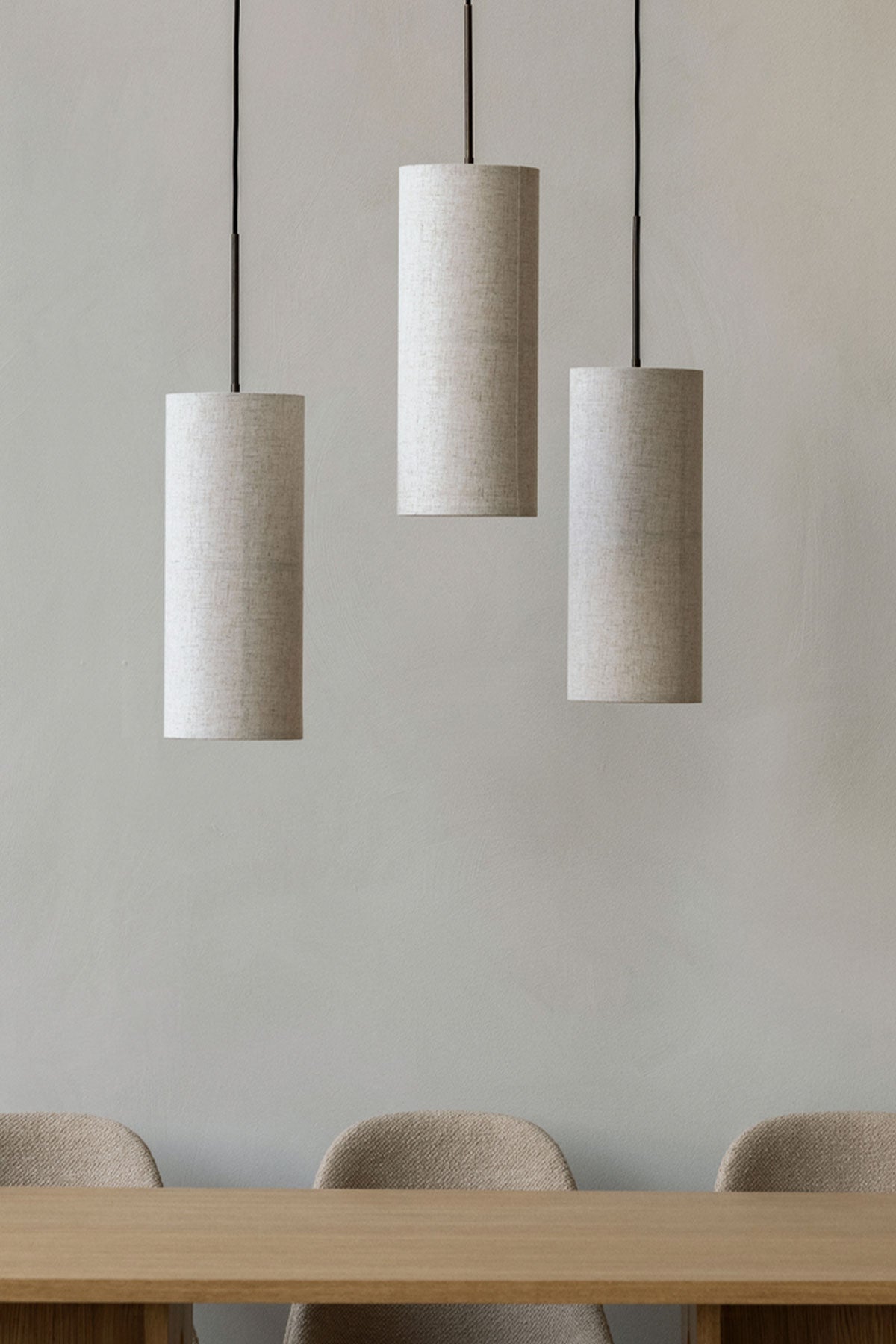 Hashira Pendant S taklampe med beige skjerm. Hashira-kolleksjonen er en moderne, nordisk vri på tradisjonelle, japanske rispapir lanterner. Hashira-lampen fyller rommet med et stemningsfylt og mykt lys, og det slanke designet med lampeskjerm av lin gir et beroligende uttrykk. Lampen henger på en sort justerbar tekstilledning, og blir et vakkert tilskudd over middagsbordet, i gangen eller på soverommet for eksempel. Like fin alene eller gruppert med flere lamper. Hashira kommer i to fargenyanser; hvit eller raw.