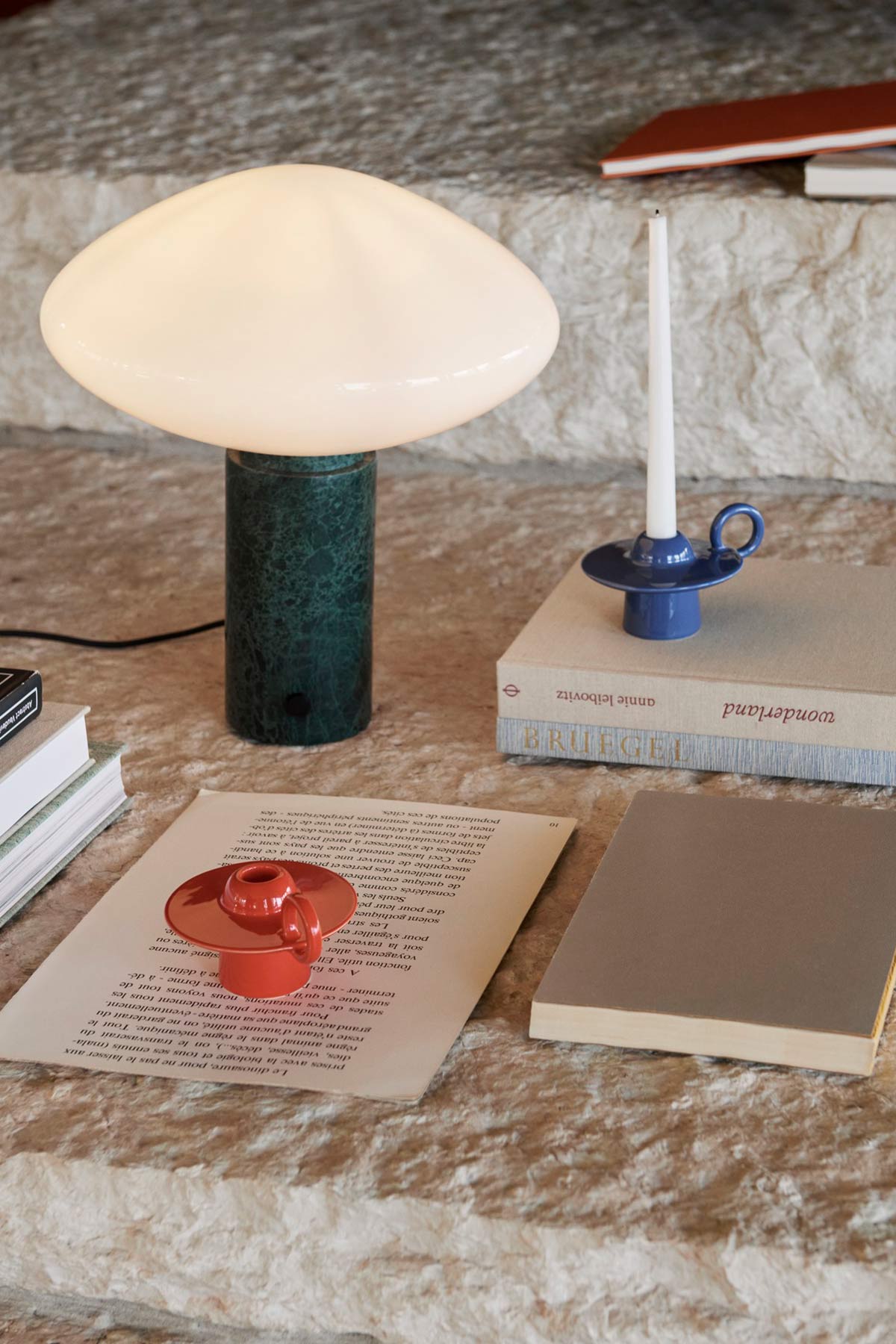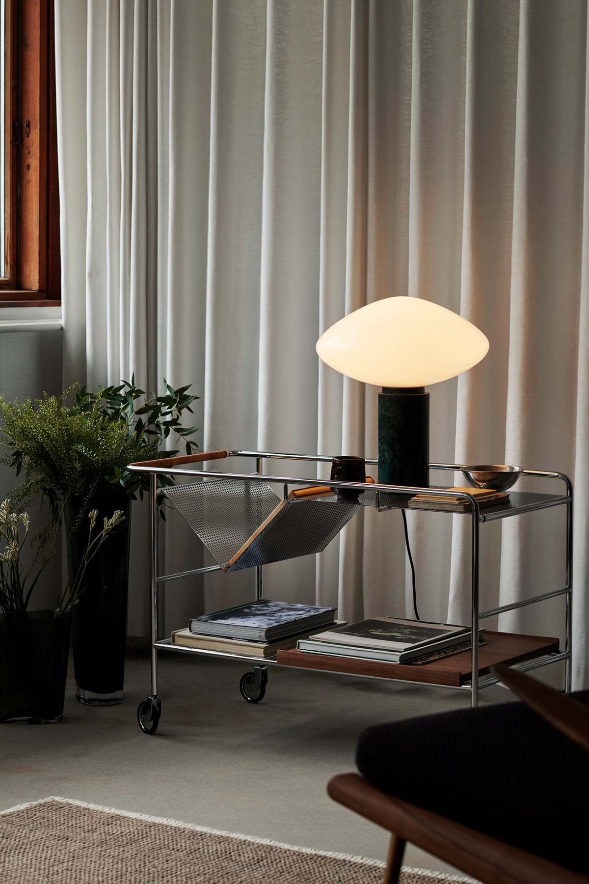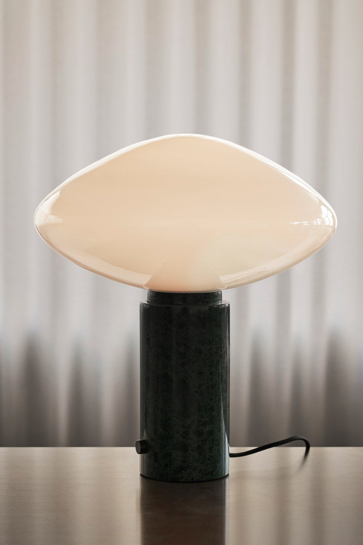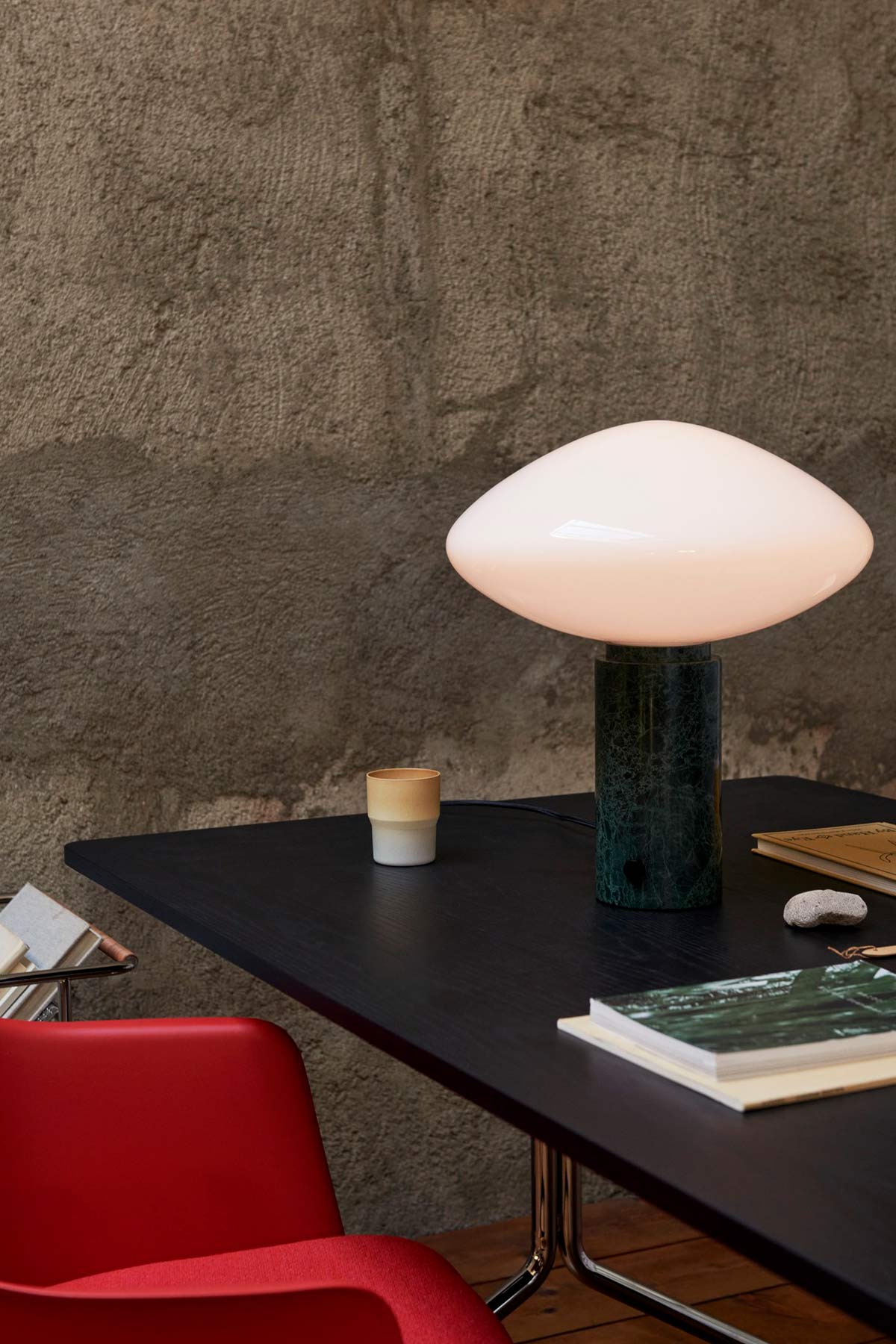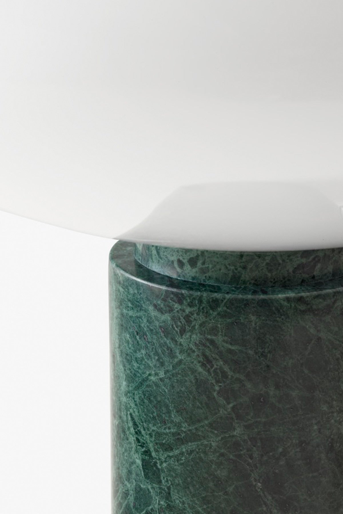 Mist bordlampe er en iøynefallende lampe med opalglass og base i grønn Guatemala Verde marmor. Lampen er designet av det København-baserte designstudioet All the Way to Paris for &Tradition. Mist er en serie med taklamper i to størrelser samt denne bordlampen, og er inspirert av det varme, diffuse lyset fra morgenlyset som skinner gjennom disen. Serien vil gi et rom dybde i stedet for å være for tøff og kan passe inn i mange rom. Mist er laget av munnblåst opalglass, og har en tykk marmorsøyle med en praktisk, liten dimmerbryter. Bruk den i stua, på et sidebord, på kontorpulten eller som nattbordslampe.
