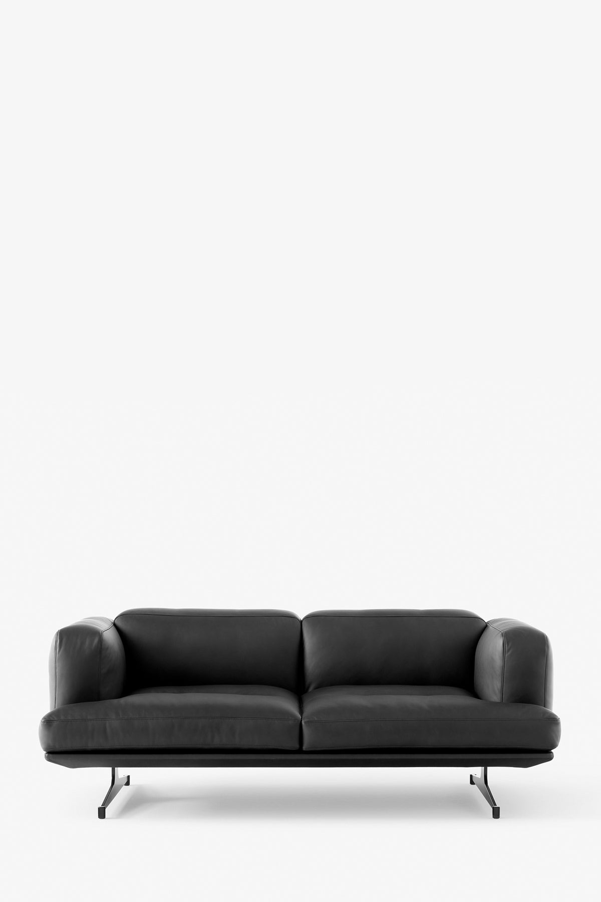 Inland AV22 2-seter sofa, designet av den Oslo-baserte designduoen Anderssen & Voll for &Tradition. Designerne ønsket en sofa som skulle gi masse komfort innenfor et klart definert arkitektonisk rammeverk. Med denne visjonen i tankene, designet de Inland, en lav, dyp sofa med høye armlener og en varm, sort stålfot som gir følelsen av at sofaen svever. Sofaens ramme er laget av massiv bøk og kryssfinér og deretter dekket med HR-skum, dyner og polyestervatt. Metallbena er frest og sveiset og deretter pulverlakkert. Sofaen er trukket i sort anilin-skinn som vil utvikle en fantastisk patina over tid. Inland finnes også som en romsligere 3-seter og kan bestilles med base i aluminium i stedet for sort, og i et hav av andre stoffer. Kom gjerne innom Bolina for å slå av en prat og kikke på stoffprøver.