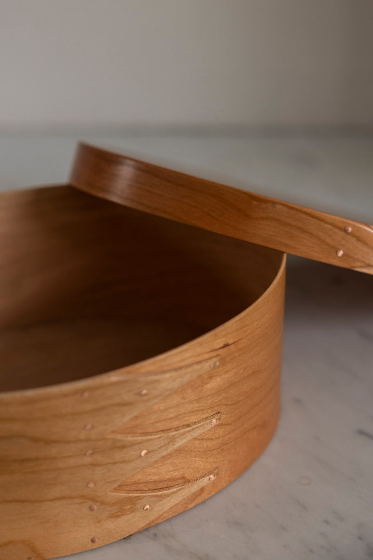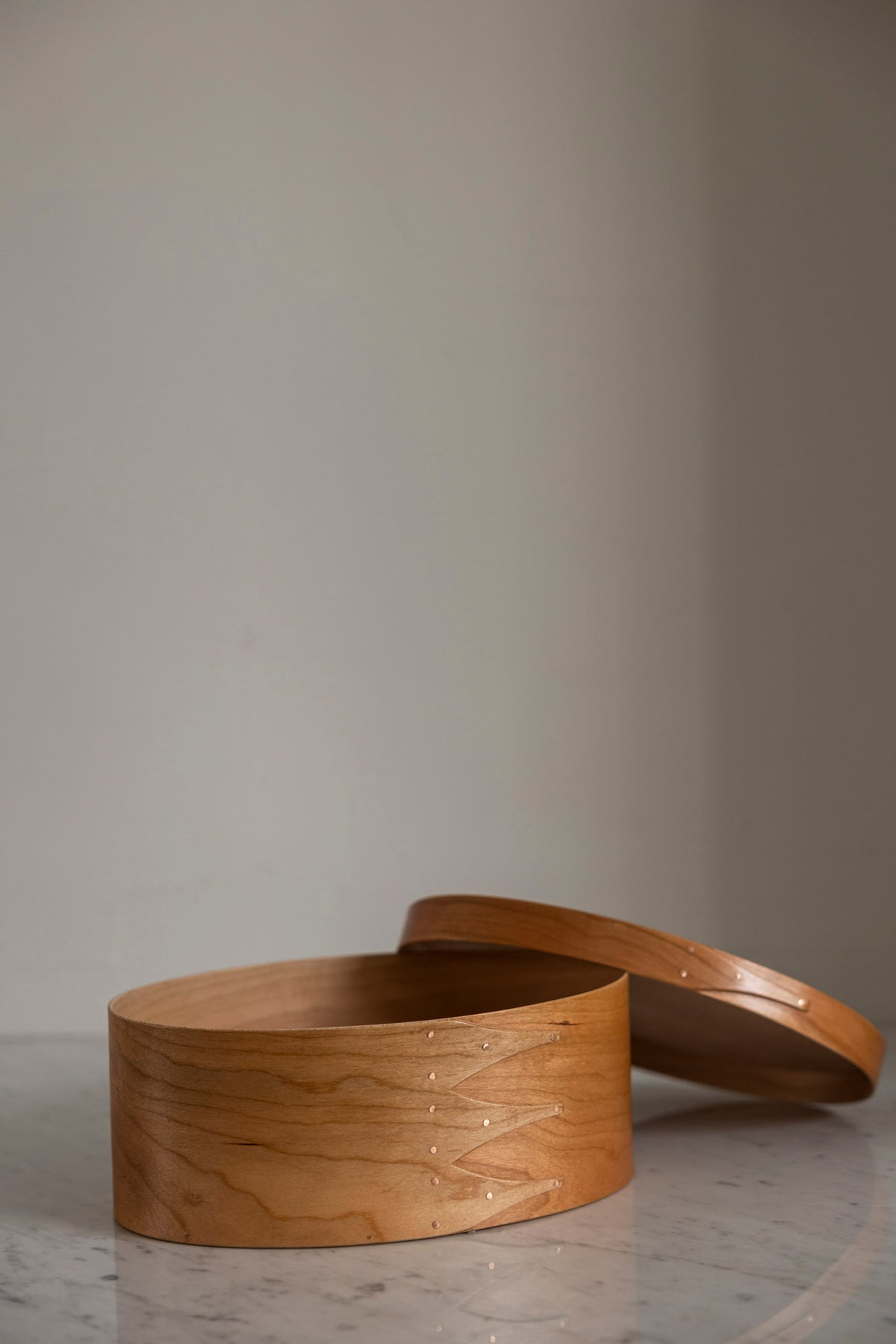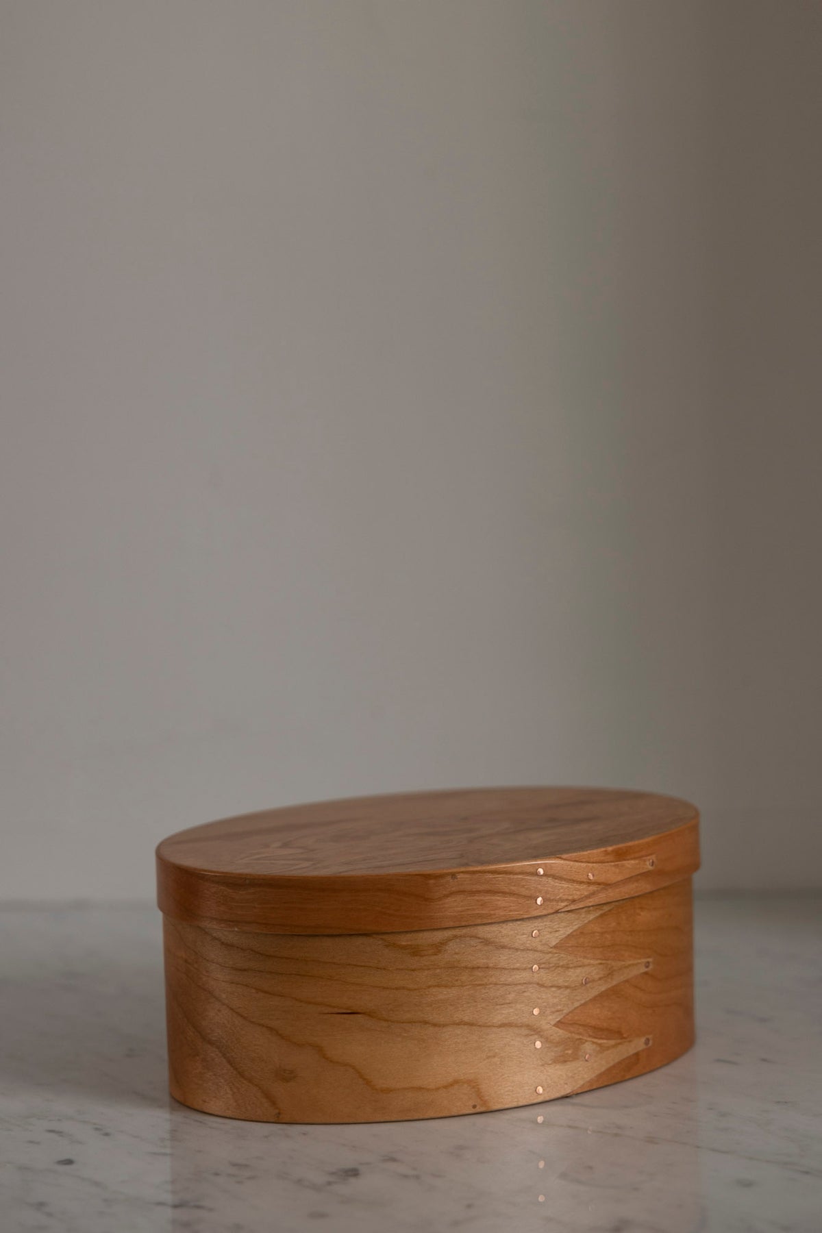 Vakker boks i kirsebærtre fra danske Shaker. De ovale Shaker-boksene er essensen av klassisk håndverk og tidløs design og er håndlaget på samme måte som de har gjort de siste 250 årene. Boksen er laget av kirsebærtre med kobbernåler og små trepinner, og er nøysomt utformet. Bruk den som dekor, oppbevaring eller en kombinasjon av begge. Boksene finnes i flere størrelser og som smykkeskrin.